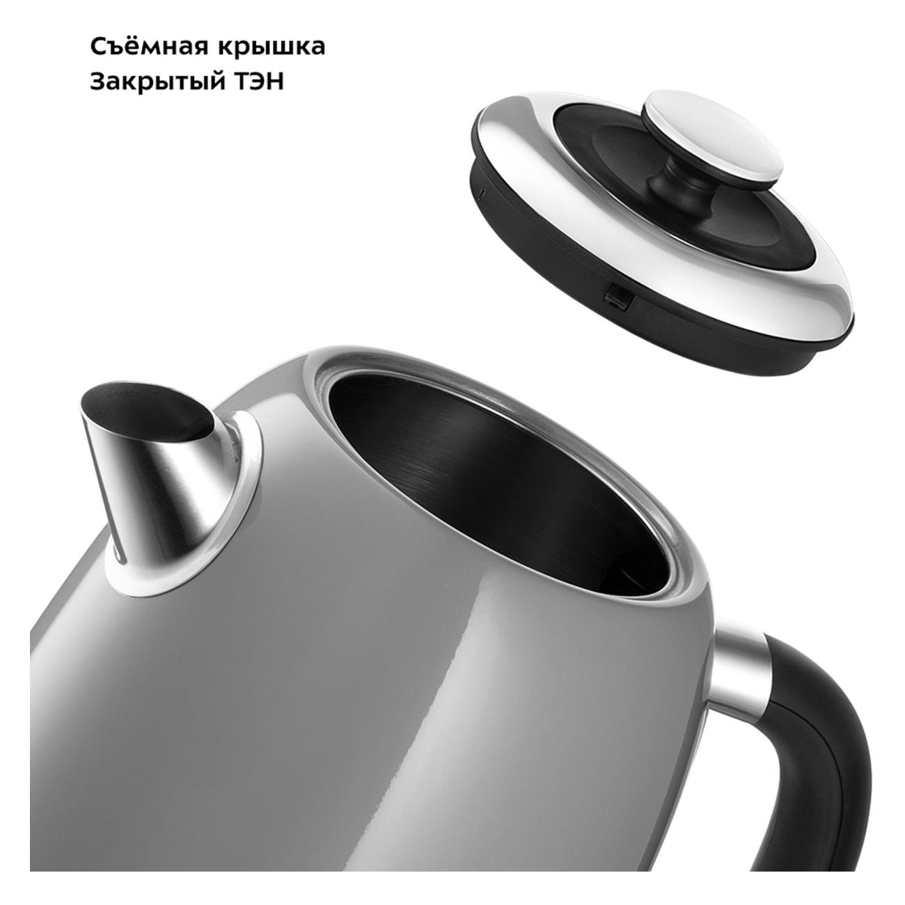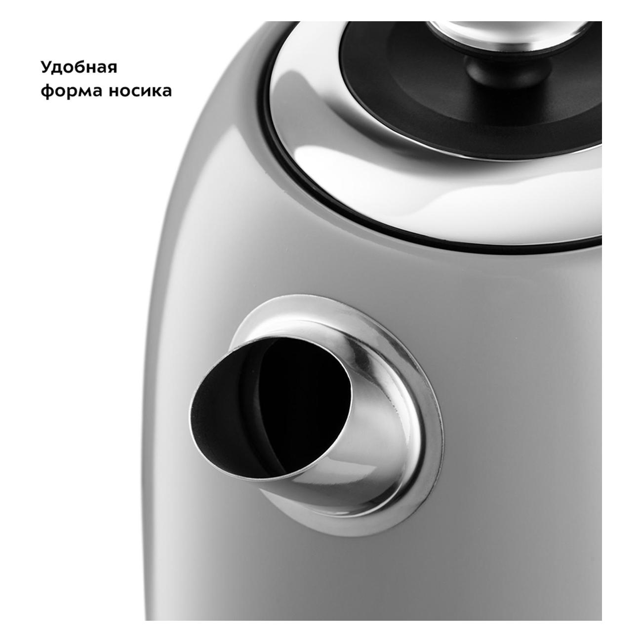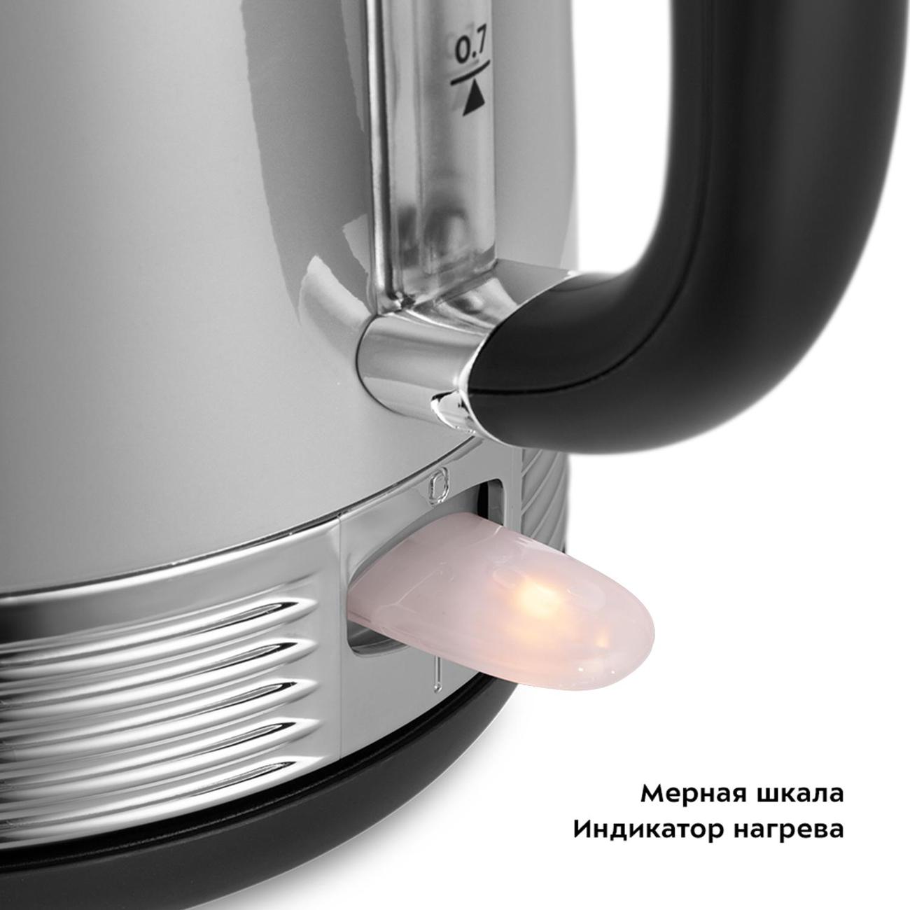 Корпус выполнен из нержавеющей стали. Нагревательный элемент (ТЭН) закрыт металлической пластиной, что препятствует появлению накипи, облегчает уход и снижает шума в процессе нагревания воды. Контроллер Strix позволяет избежать рисков замыкания, что значительно повышает безопасность эксплуатации электрочайника. В случае отсутствия воды работа устройства прекращается. Вес модели при размерах 15,5х22,5х26 см составляет 0,86 кг.