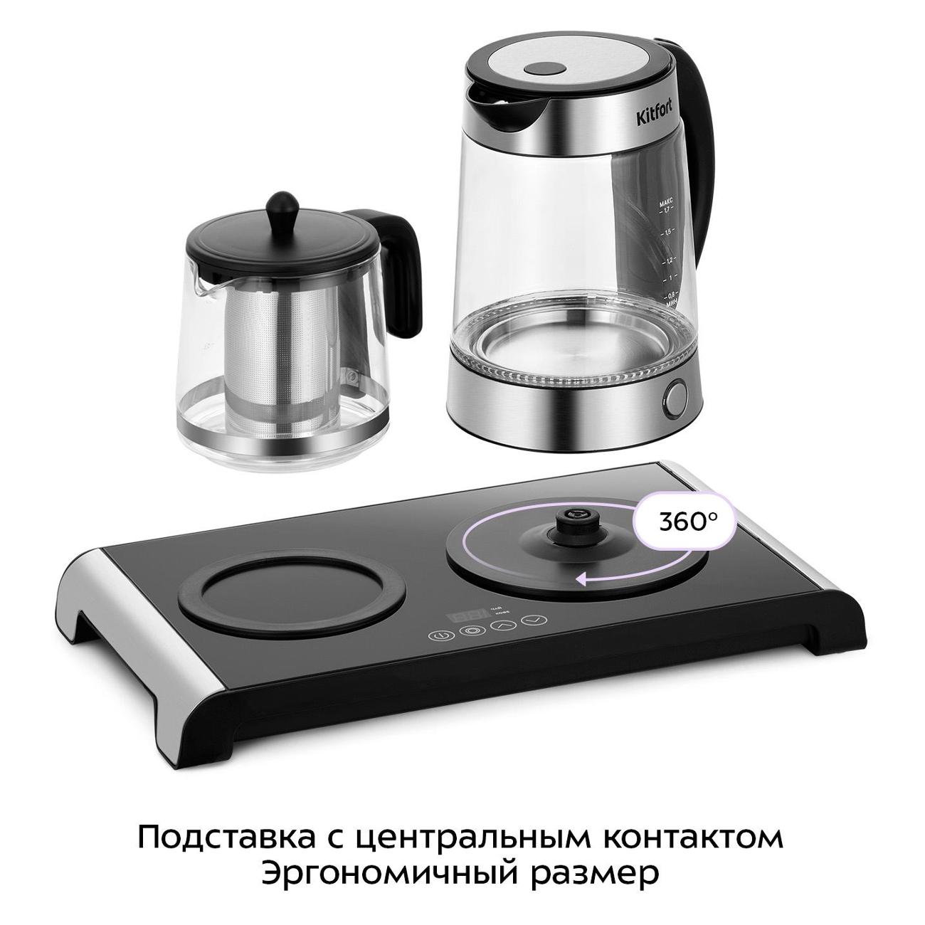 Очень давно хотела подобный чайный набор. Выглядит потрясающе, чайник с подсветкой и индикатором нагрева, закипает быстро, не шумный, отключается при закипании. Удобная база для чайника и заварочного чайника, поддержание температуры можно переключить на чай/кофе от 60° до 80°, но подогрев только для заварочного чайника. Основной чайник работает как обычно: до закипания, либо на нужной температуре отключение вручную. Выглядит комплект стильно, украсил мою кухню. Кто ценит красоту, удобство и качество - это для вас!