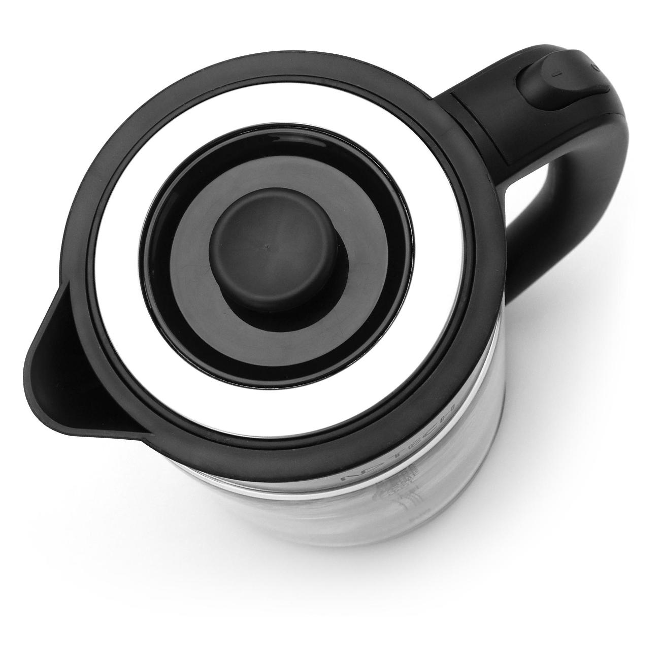 Отключение производится автоматически при закипании, включении без воды и снятии с основания. На базу чайник можно ставить с любой стороны и вращать на 360° — и правшам, и левшам будет удобно.