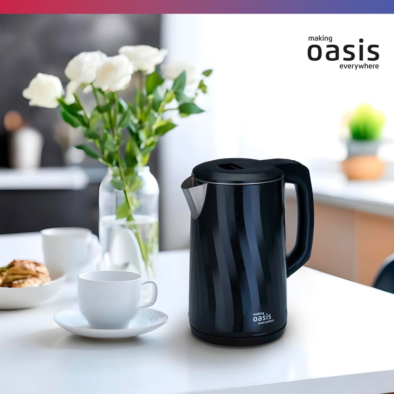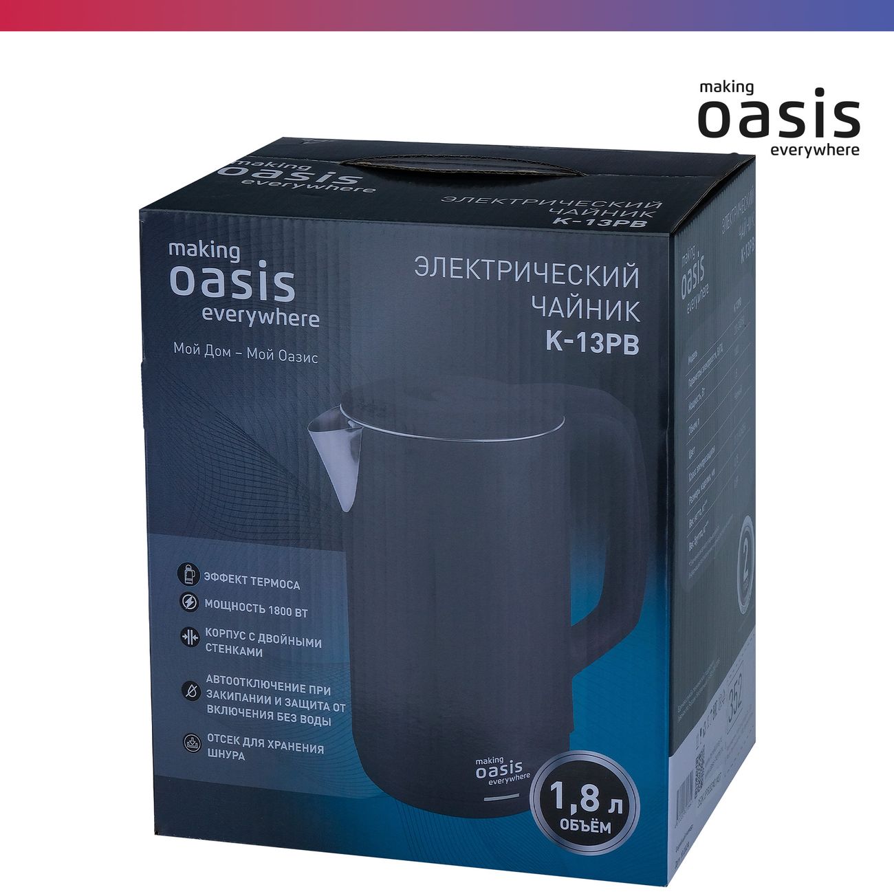 Электрический чайник making Oasis everywhere K-13PB имеет объем 1,8 л. Благодаря мощности 1800 Ватт быстро доводит жидкость до кипения.