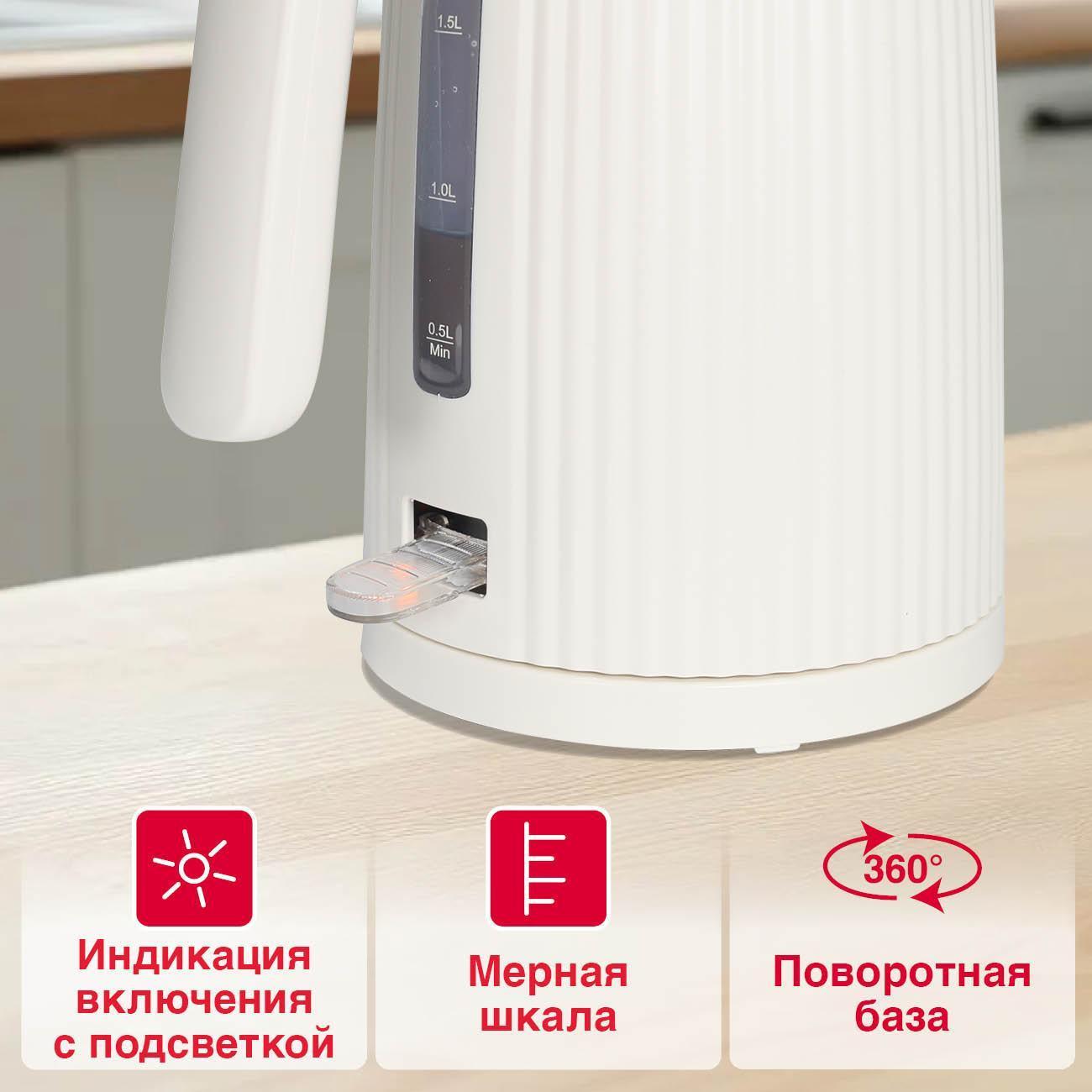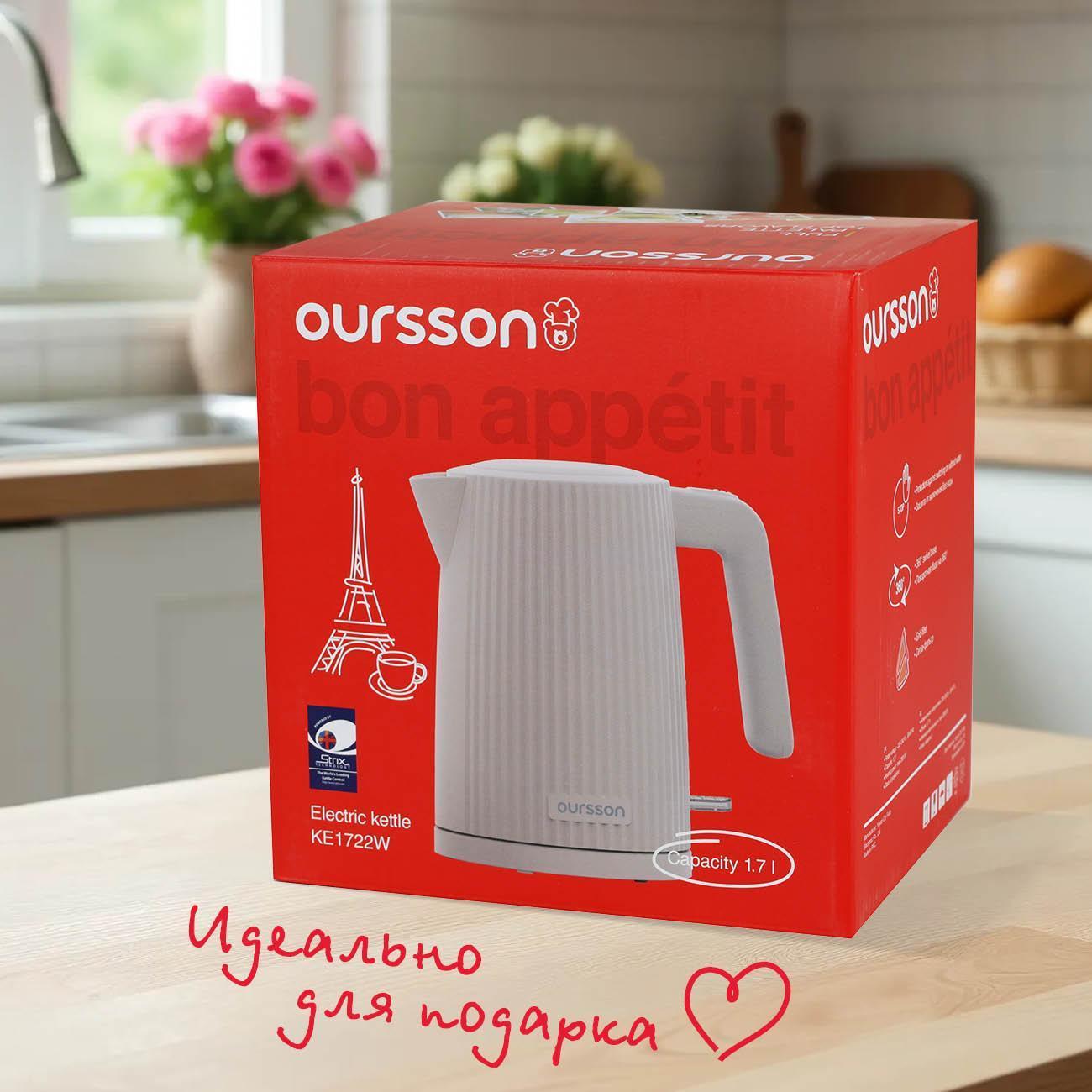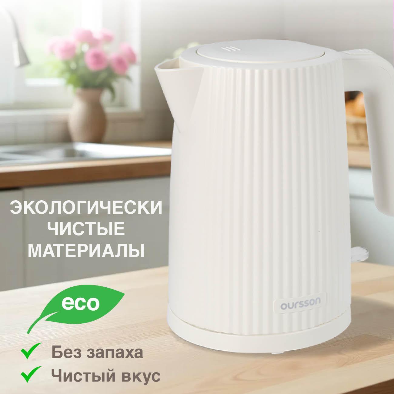 Электрочайник Oursson KE1722W/IV оснащен нагревательным элементом 2200 Вт, подключается к розетке сетевым шнуром 0,8 м.