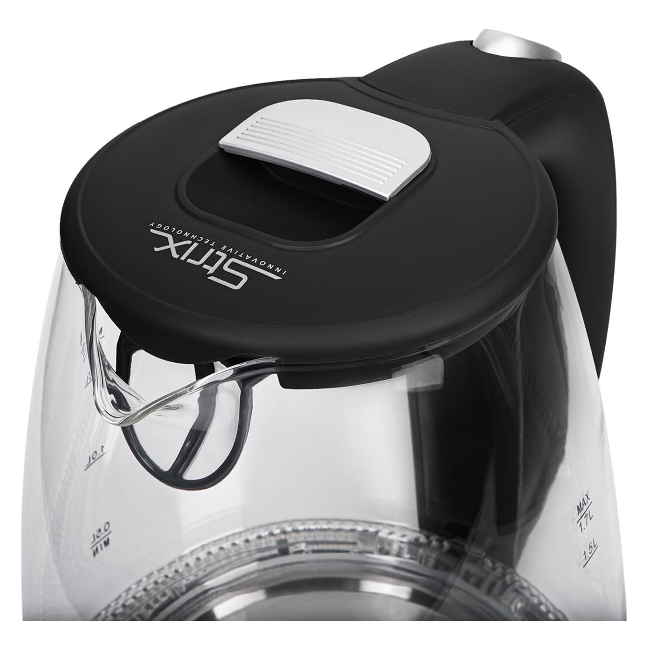 Искали чайник, чтобы вся колба была стеклянная, без вставок, чтобы видно было что пьешь. Запаха пластика сразу после покупки нет. Вода не приобретает пластиковый вкус от чайника. Мне нравится механическая клавиша на крышке-внушает доверие, в отличие от кнопок. Есть ненавязчивая подсветка. Быстрый и не супер шумный. Носик хороший-не капает и не льется мимо кружки по корпусу чайника. В подставке есть место, куда можно намотать (спрятать) лишний провод, который идёт к розетке.