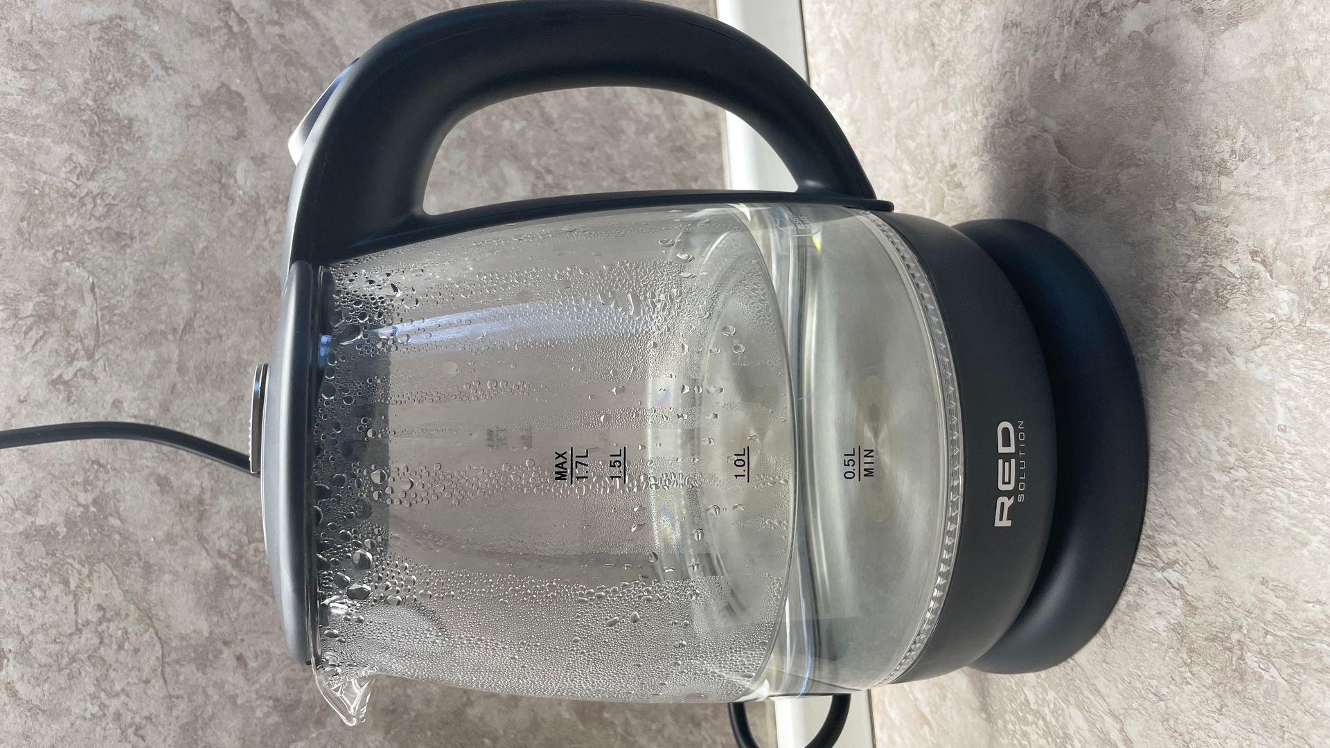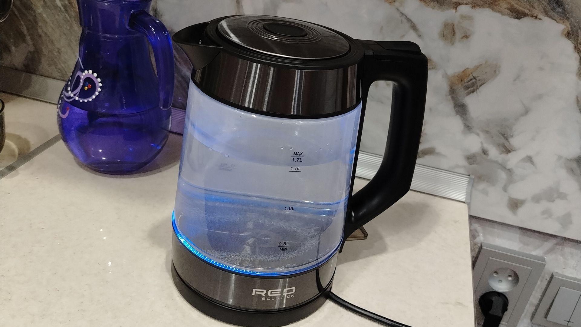 Стеклянный электрический чайник Red Solution, срок эксплуатации 7 дней. Претензий к чайнику нет, работает исправно.
