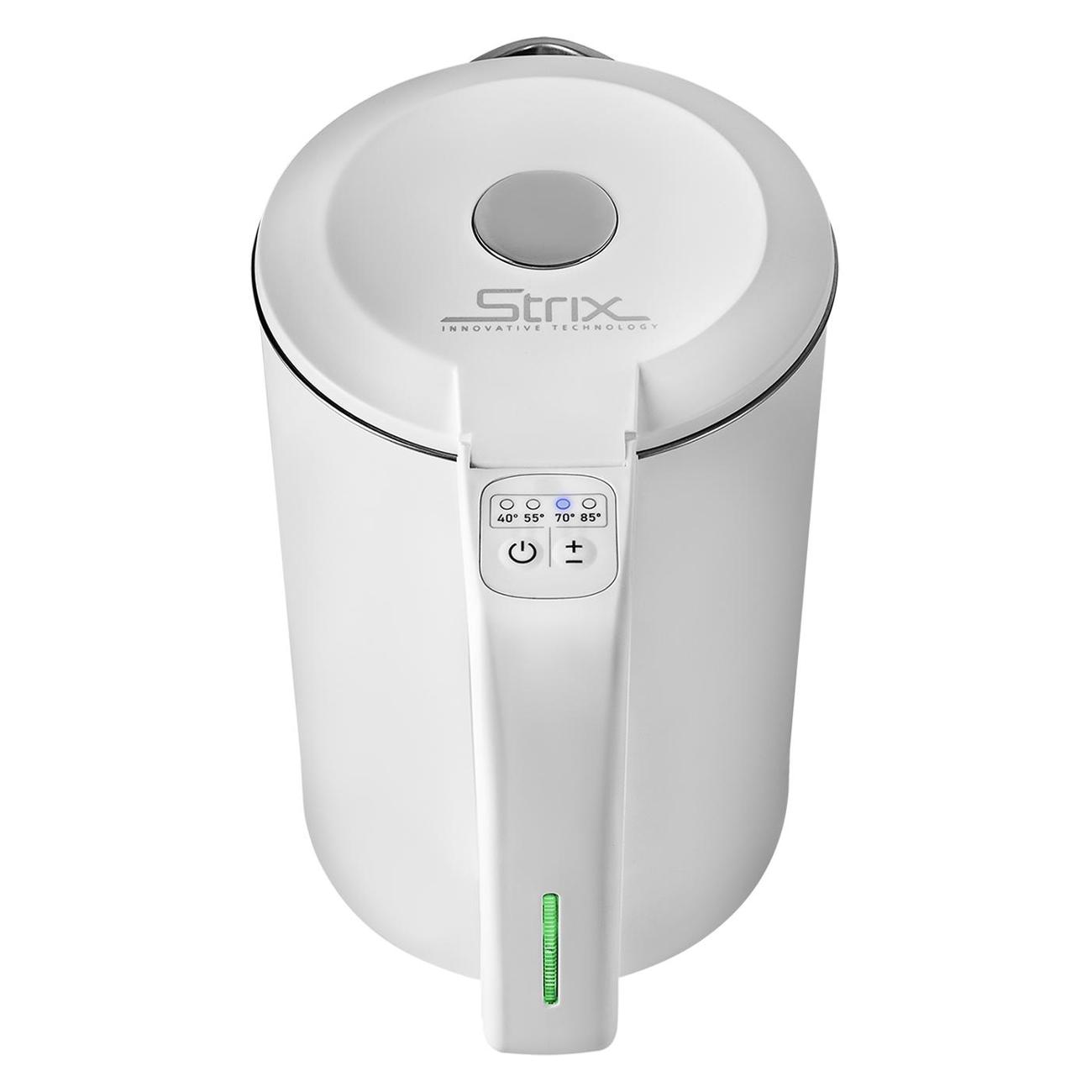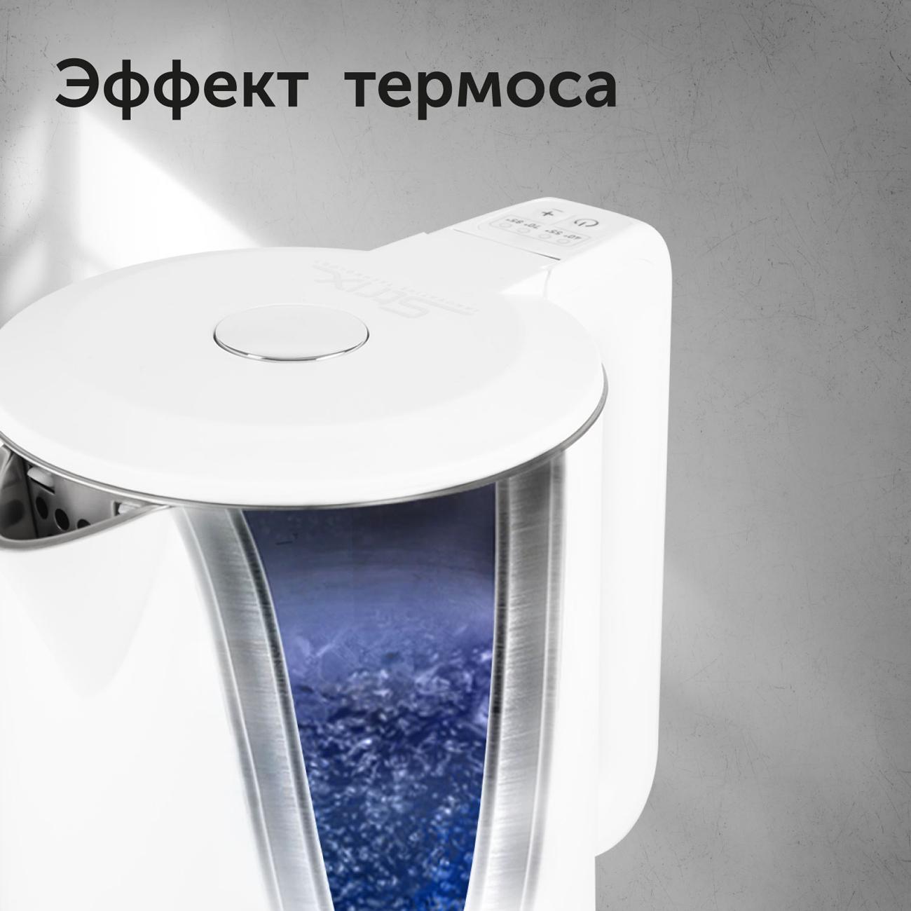 Используется нержавеющая сталь марки ANSI 304, которая отличается повышенной устойчивостью к коррозии и долговечностью, не оказывает влияния на вкус и запах воды. Крышка широко откидывается, что облегчает залив воды и уход за чайником. Контактная группа Strix отвечает за автоматическое отключении при закипании, включении без воды и снятии с базы.