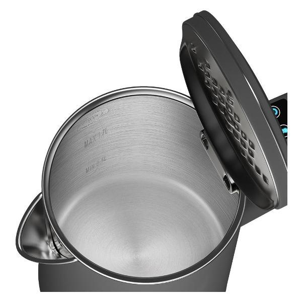Резервуар выполнен из цельного листа металла без швов, что гарантирует герметичность. Контактная группа Strix обеспечивает до 12 000 циклов кипячения и защищает от перегрева. Объем емкости — 1,7 л, мощность — 2200 Вт. Длина шнура — 0,65 м.