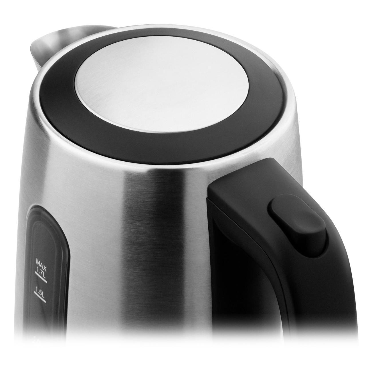 Корпус изготовлен из нержавеющей стали, что гарантирует долговечность и сохранение презентабельности. Объем чайника составляет 1,7 л. Система защиты отключает прибор при закипании и отсутствии воды.