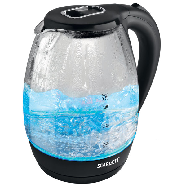 Scarlett SC-224 имеет новаторский дизайн, резервуар чайника прозрачный, с яркой синей подсветкой. Это даёт возможность следить за процессом закипания воды.