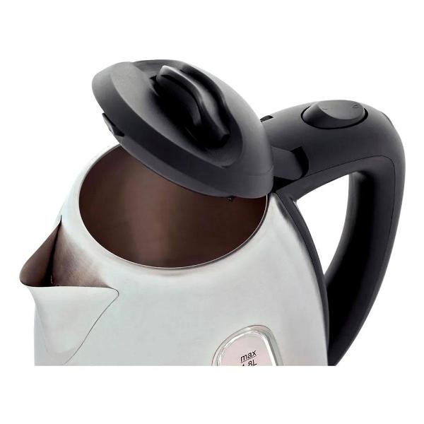 Корпус прибора сделан из стали и термостойкого пластика. Встроенный фильтр предотвращает попадание накипи в кружку. Предусмотрен специальный отсек, в который сматывается шнур питания. Если в колбе нет воды и в момент закипания срабатывает автоматическое отключение. Управление обеспечивает механическая кнопка, крышка откидывается с помощью клавиши. Вес чайника — 1 кг.