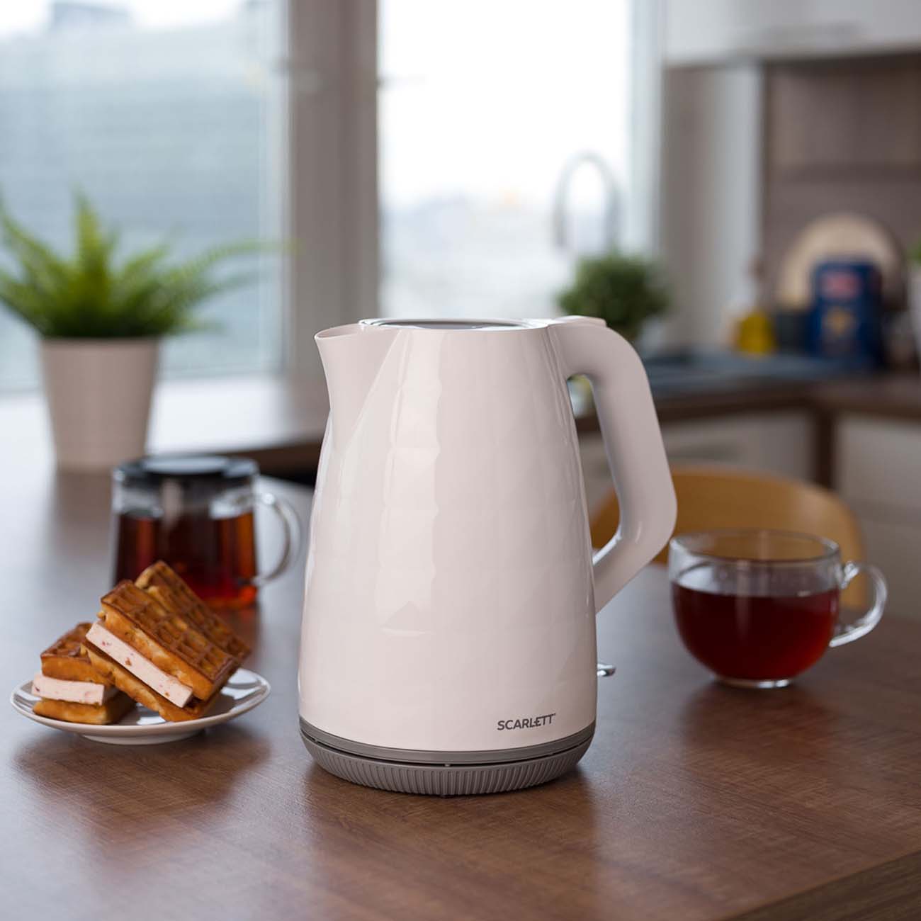 Купила его в подарок бабушке. На кухне смотрится стильно из-за необычного дизайна. Перед первым использованием, дважды прокипятили в нем воду, с добавлением лимонной кислоты для устранения посторонних запахов. Это так на всякий случай, пластиком он изначально не вонял. Бабушка очень довольна.