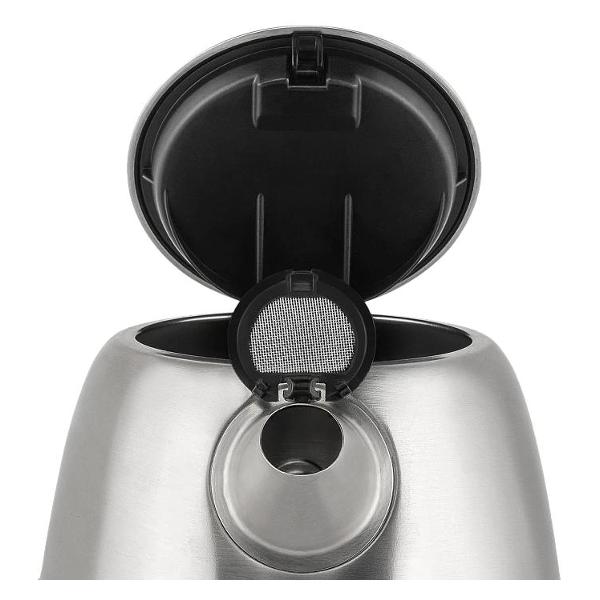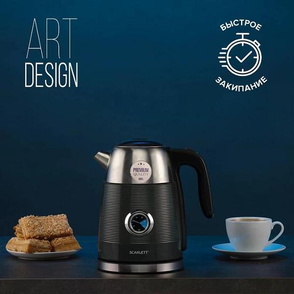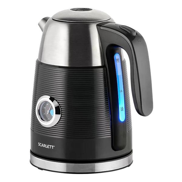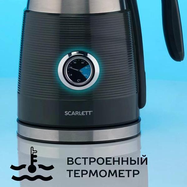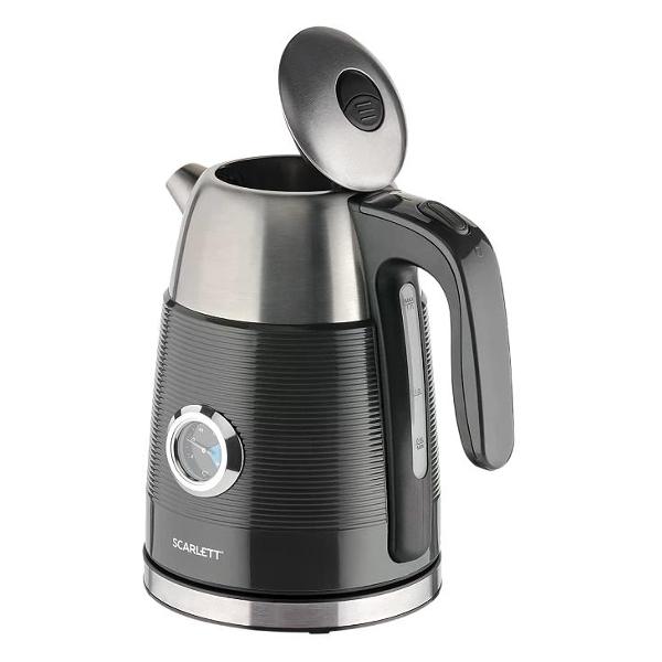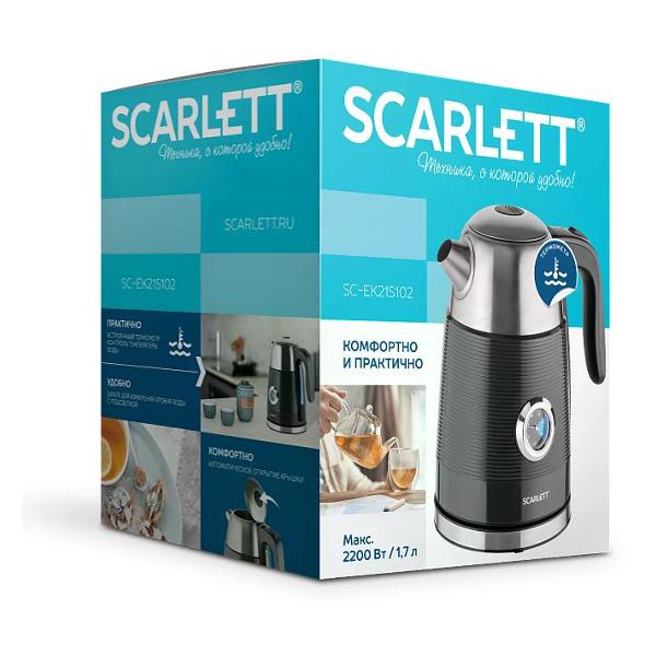 Электрочайник Scarlett SC-EK21S102 объемом 1,7 л работает через подключение к сети электропитания с помощью шнура протяженностью 0,75 л. Потребляемая мощность — 2200 Вт. Модель нагревает воду до 100°С. Металлический корпус графитового цвета размещает фильтр, предотвращающий попадание накипи в напиток, отсек для хранения провода. Крышка открывается одним нажатием.
