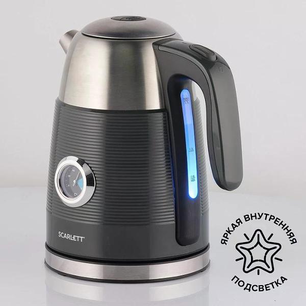 Предусмотрена многоуровневая система безопасности Safe Work: чайник самостоятельно отключается при закипании и отсутствии жидкости. Устройство оснащено внутренней яркой подсветкой. Управление — механическое. Индикаторы отражают информацию о включении, уровне воды в резервуаре, температуре. Вес — 0,92 кг. Габариты — 24,5х20х16 см.