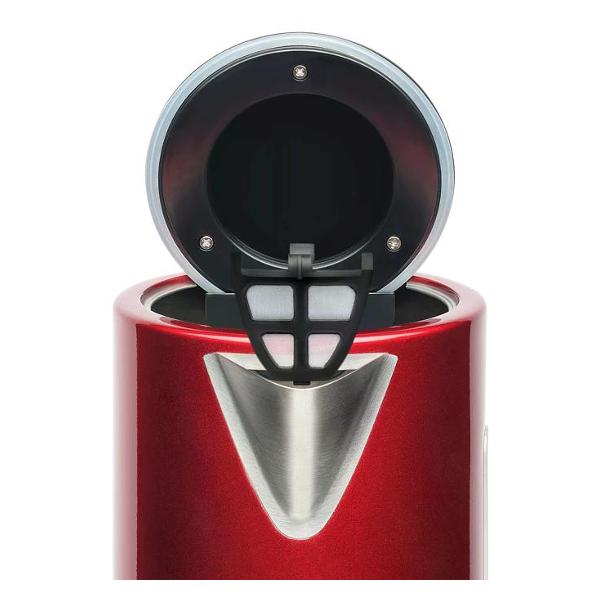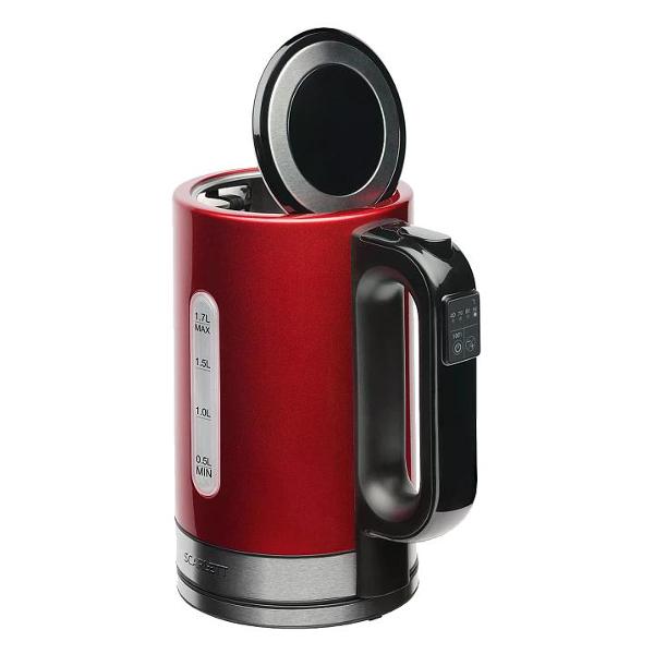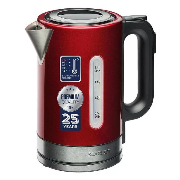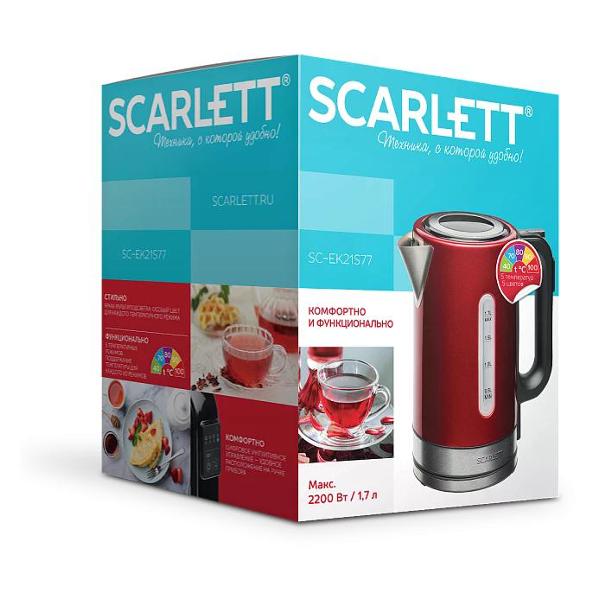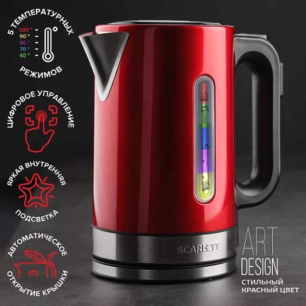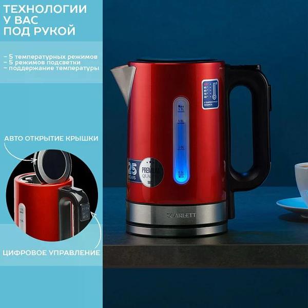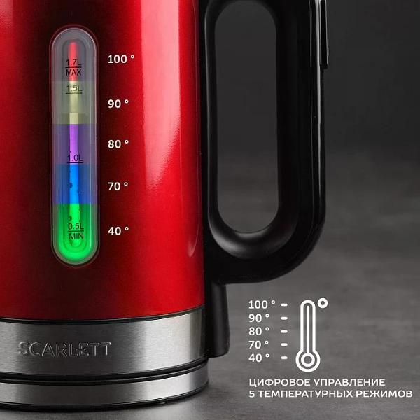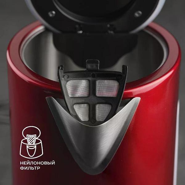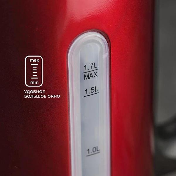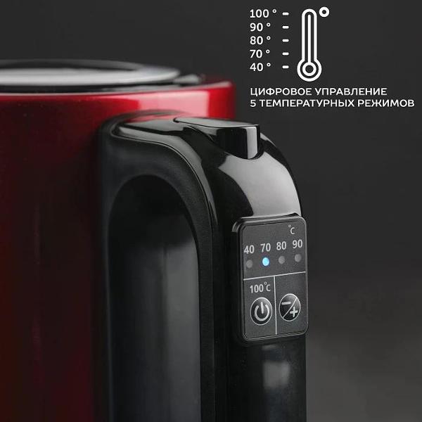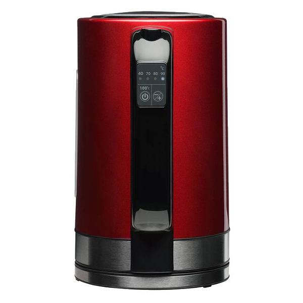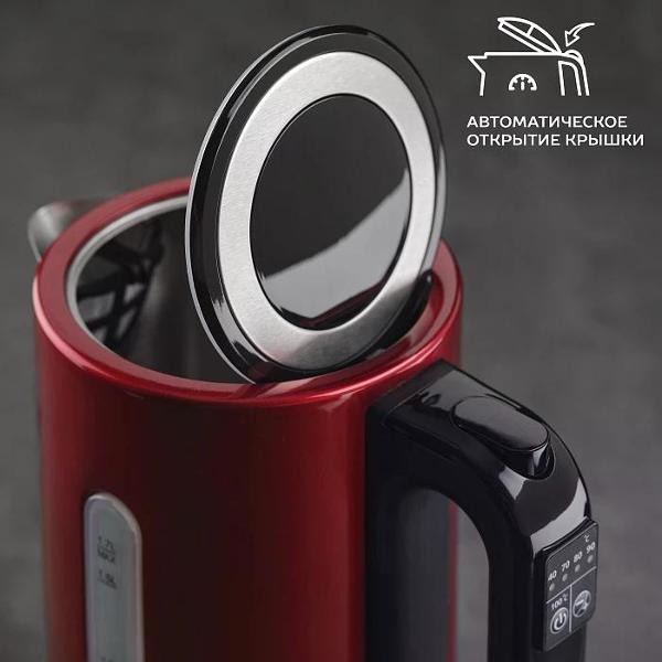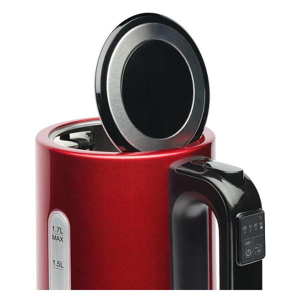 Объем прибора составляет 1,7 л. Корпус красного цвета выполнен из металла. На ручке установлена система цифрового управления температурой. В носике размещен фильтр от накипи. Открытие крышки автоматическое, происходит в одно касание. Установлен индикатор включения, уровня воды и температуры. Длина электрошнура составляет 0,75 м. Вес равен 0,97 кг. Габаритные размеры — 24х22х13,5 см.