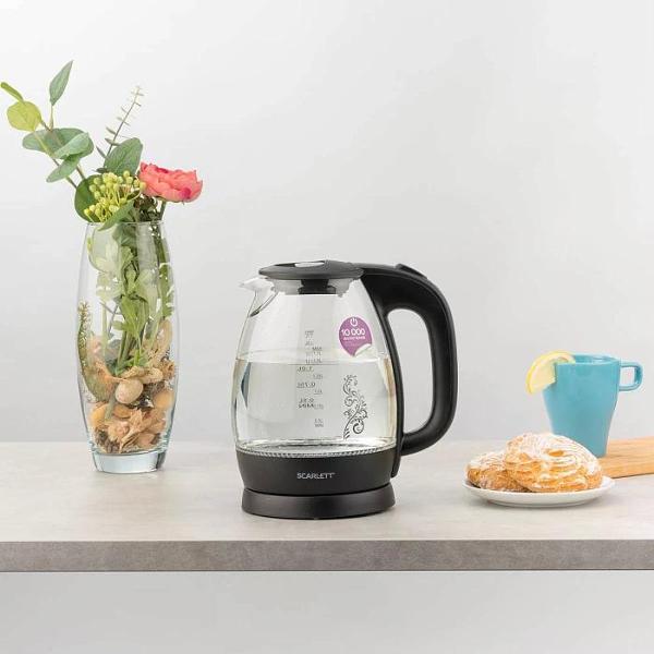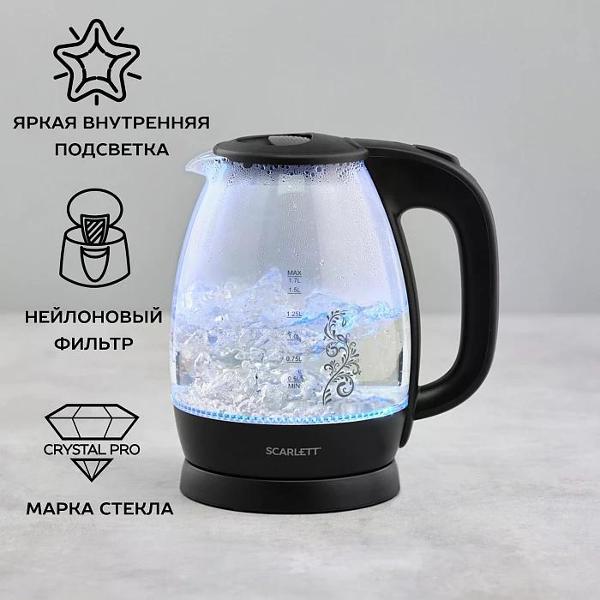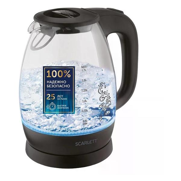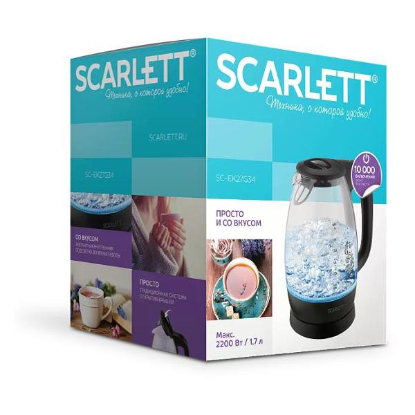 Электрочайник Scarlett SC-EK27G34 — модель черного цвета, обладающая объемом 1,7 л. Предусмотрена удобная ручка для открытия крышки. Широкая ручка не соскальзывает и обеспечивает надежный хват. Установлена яркая и эффектная подсветка голубого цвета, которая может выступать индикатором работы чайника. В носки встроен фильтр из износостойкого нейлона — позволяет избежать попадания частичек накипи в напиток.