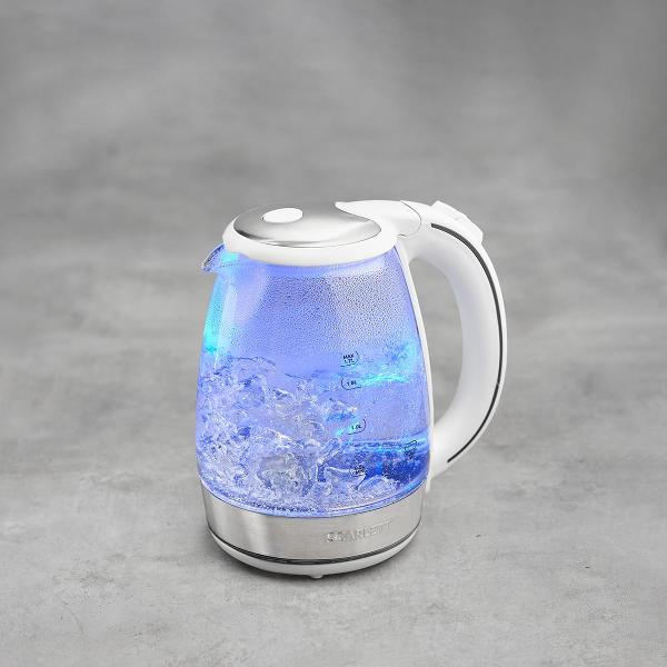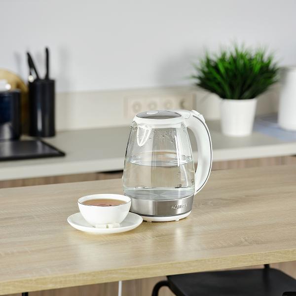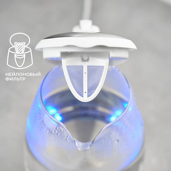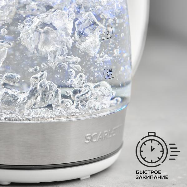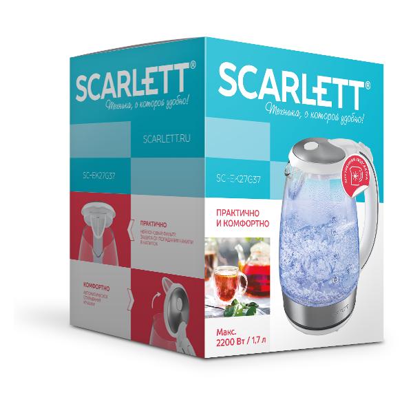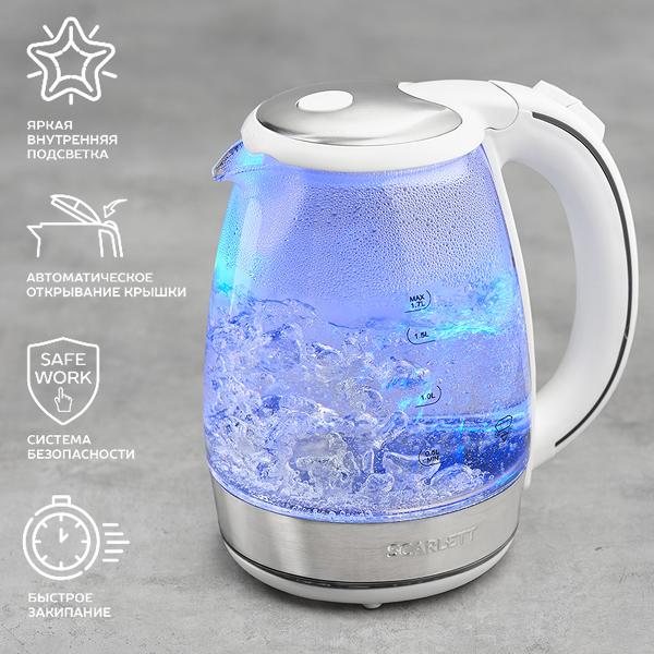 Электрочайник Scarlett SC-EK27G37 вместимостью 1,7 л отличается прочной колбой из жаропрочного стекла Crystal Pro. Нанесенная градуированная шкала позволяет отслеживать объем. При запуске загорается встроенная LED-подсветка голубого цвета. Устройство с механическим управлением отключается автоматически при достижении 100°C. Носик дополнен сетчатым фильтром, предотвращающим попадание накипи.