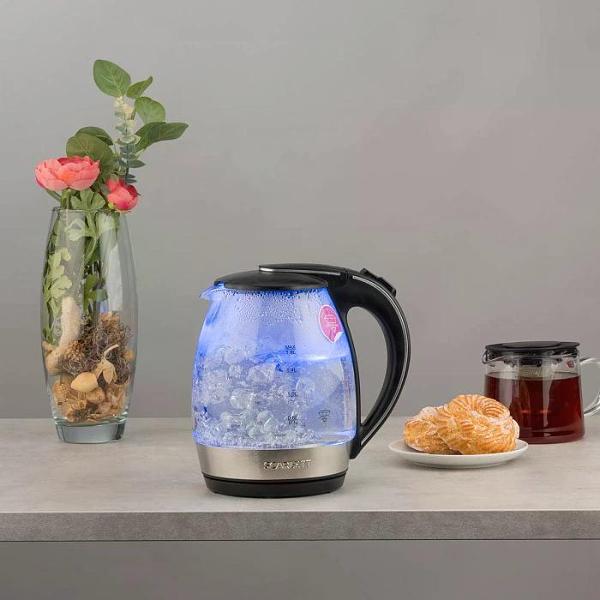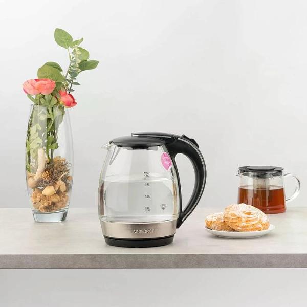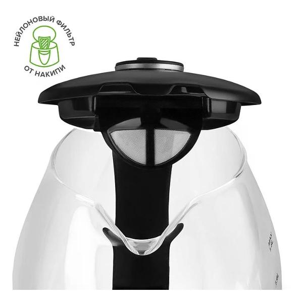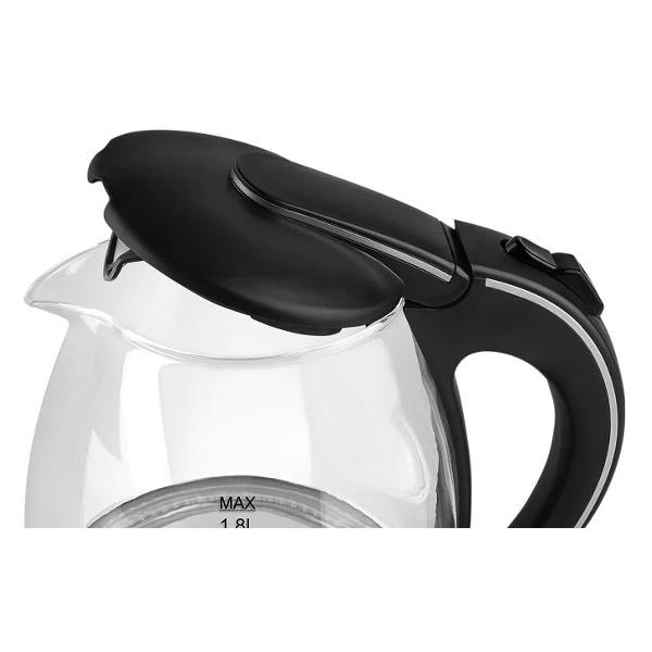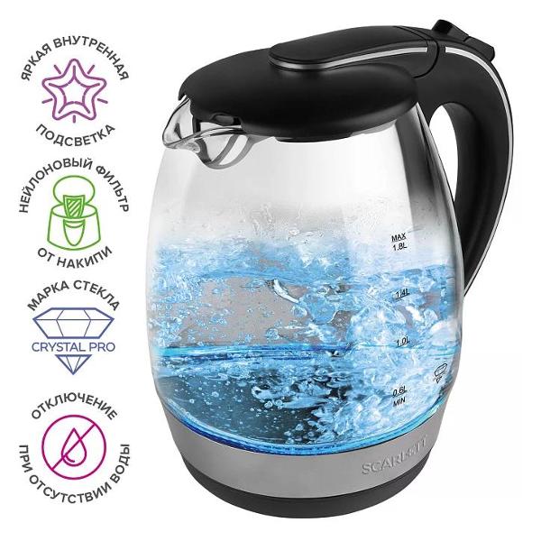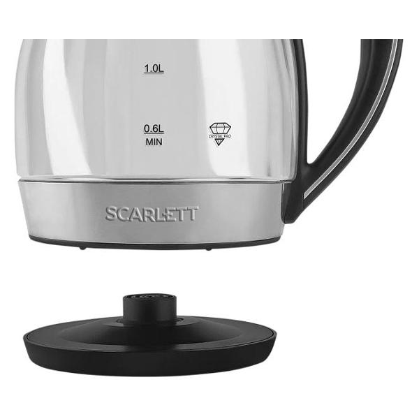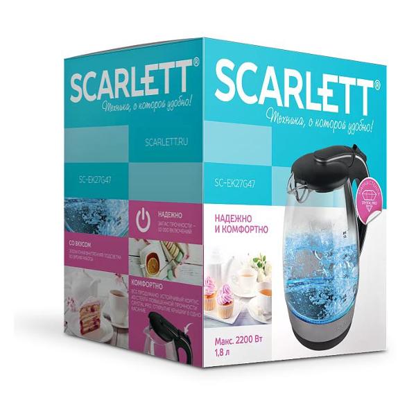 Электрочайник Scarlett SC-EK27G47 — удобная и простая в эксплуатации модель, потребляемая мощность которой достигает 2200 Вт. Максимальный объем составляет 1,8 л. Предусмотрена шкала, нанесенная на прозрачный корпус из прочного стекла — позволяет точно отмерять количество воды. Плотно прилегающая крышка открывается путем нажатия на кнопку. Установлен фильтр (из нейлона) для накипи — на носике. Предусмотрен один режим нагрева. Устройство дополнено эффектной внутренней подсветкой голубого цвета. Длина сетевого шнура — 0,7 м. При размерах 20,5х20х15 см вес чайника составляет 0,9 кг.
