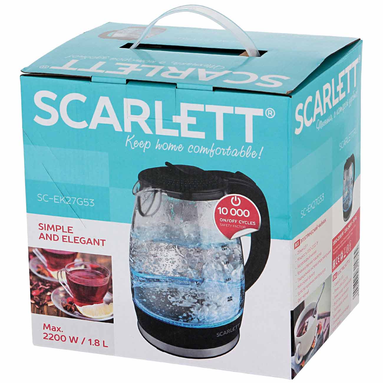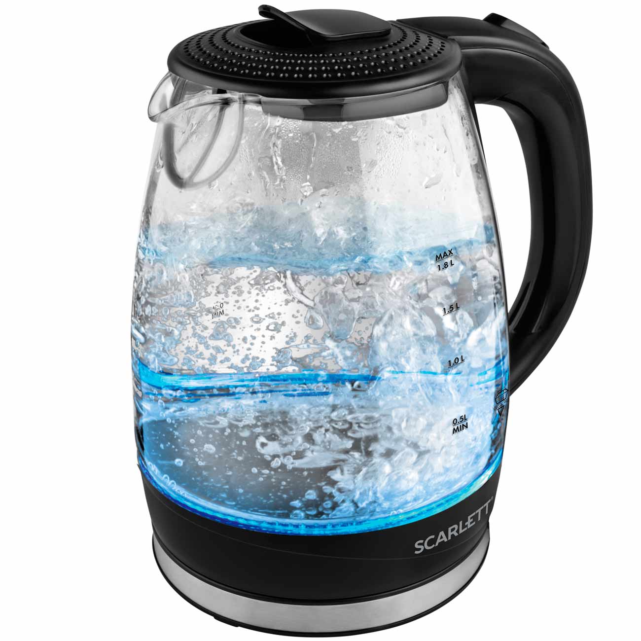 Scarlett SC-EK27G53 обращает на себя внимание яркой светодиодной подсветкой голубого цвета, в которой эффектно смотрятся пузырьки воздуха, появляющиеся в процессе нагрева. Прибор органично впишется в любой современный кухонный интерьер и станет его украшением.