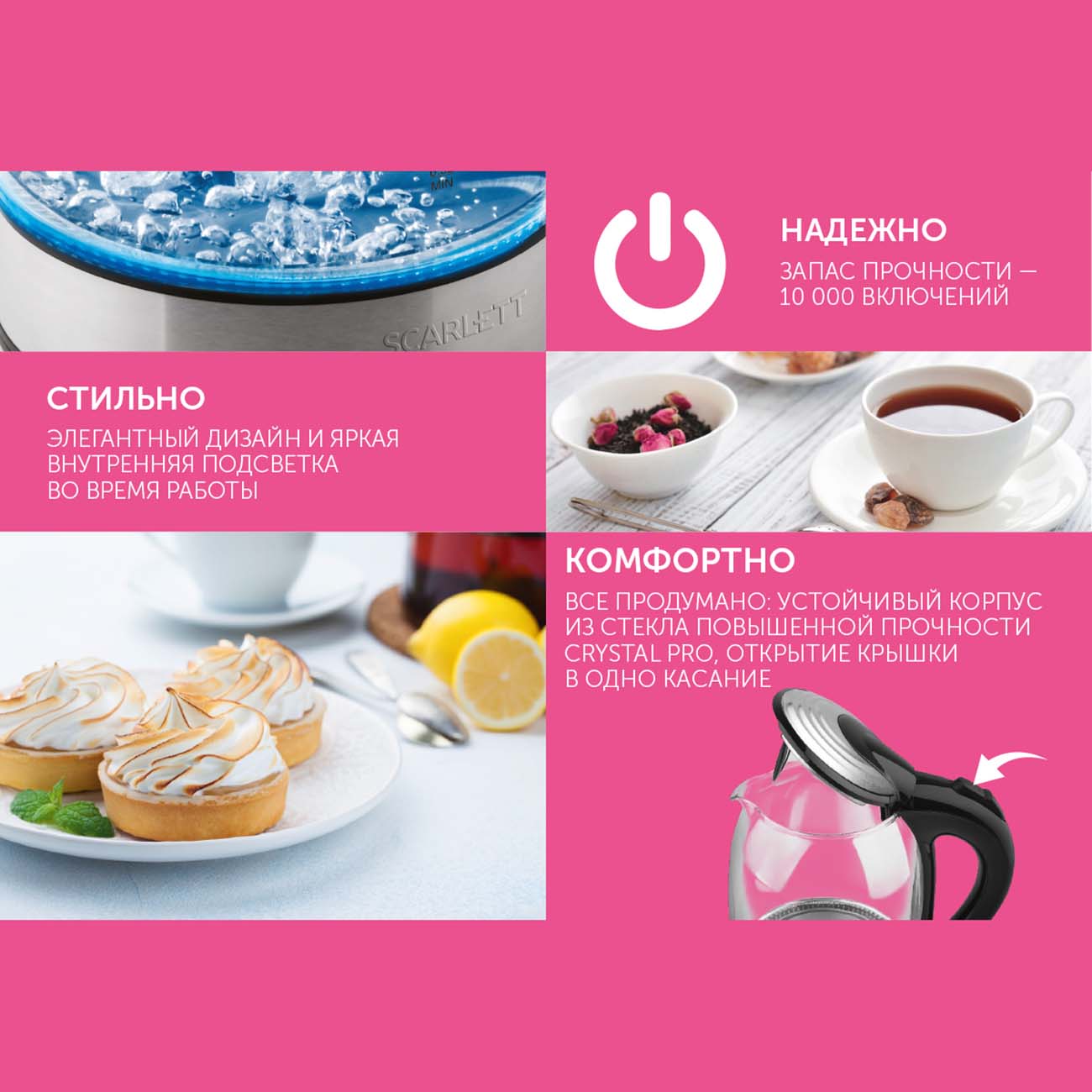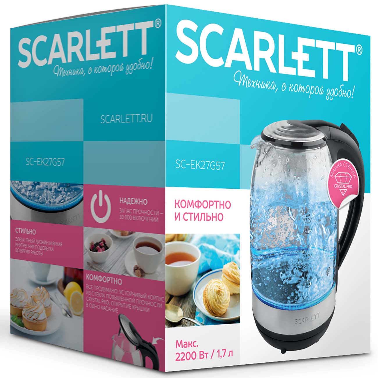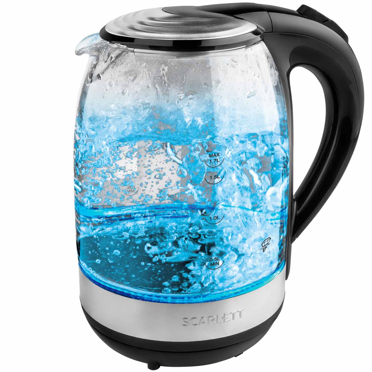 Электрический чайник Scarlett SC-EK27G57 – хороший выбор для ценителей не только функциональной, но и стильной бытовой техники. Корпус этой модели, изготовленный из стекла повышенной прочности, дополнен яркой внутренней подсветкой, и благодаря ей владелец получает возможность любоваться красивой игрой пузырьков.