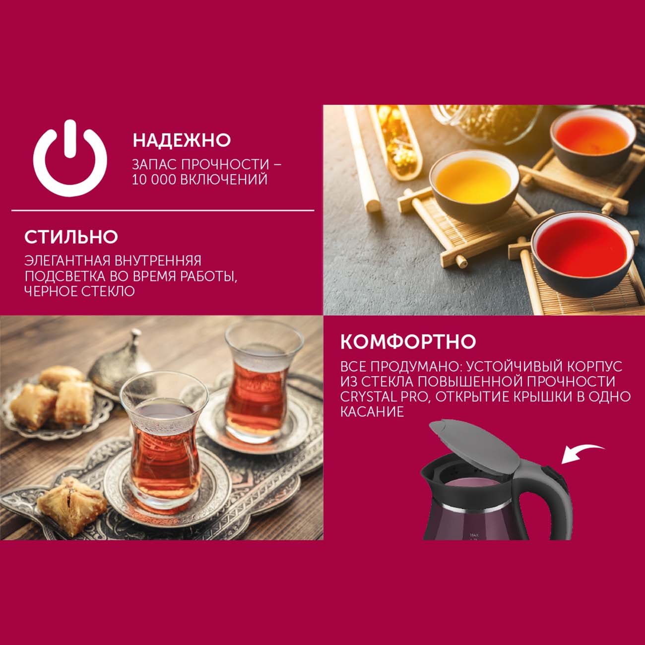 Прочный корпус сделан из качественного термостойкого стекла Crystal Pro, которое не меняет вкусовых качеств воды, не выделяет вредных веществ и полностью безопасно для здоровья человека. Многоуровневая система защиты Safe Work своевременно отключает чайник при закипании и не даёт включить прибор, если в нём нет воды, таким образом защищая устройство от поломок.