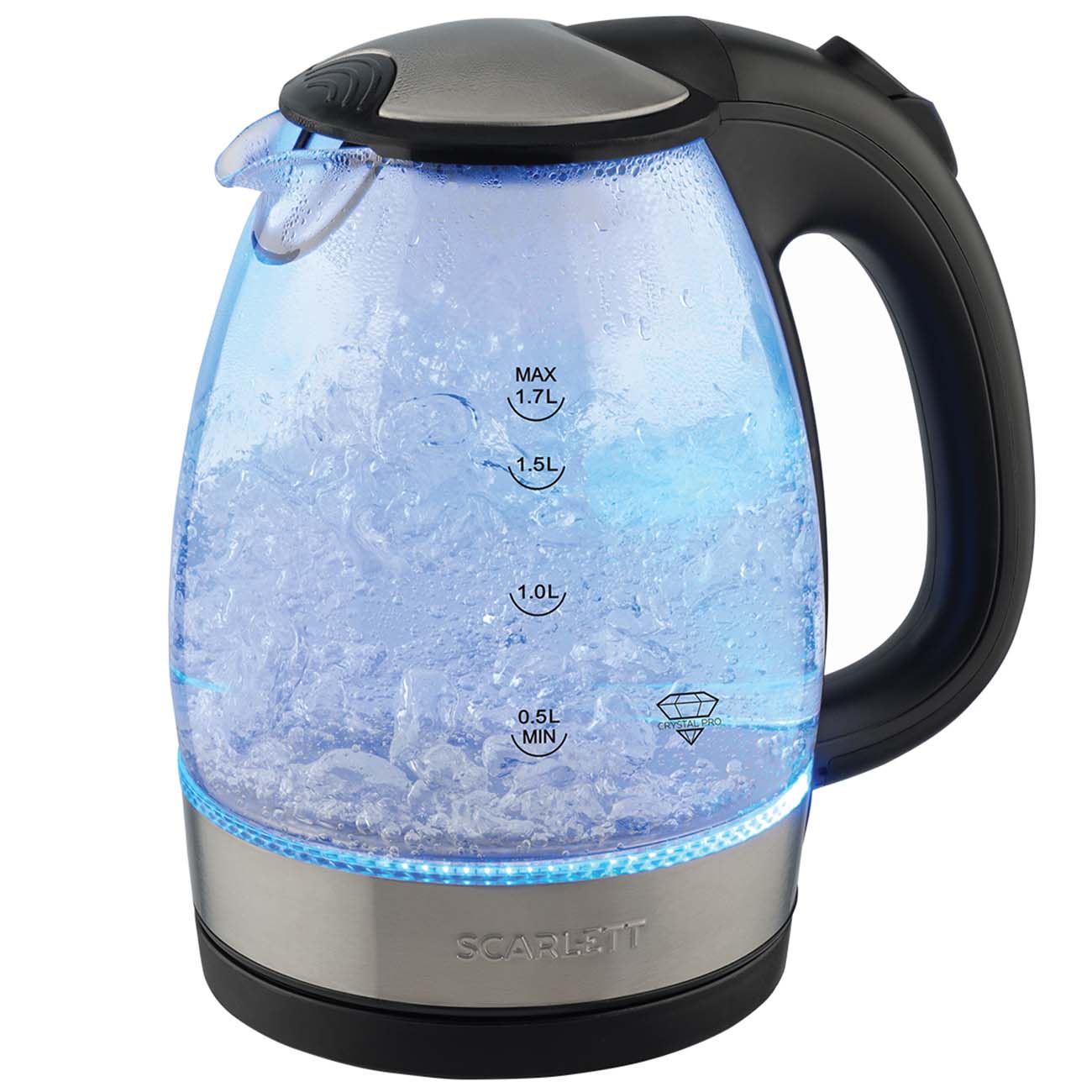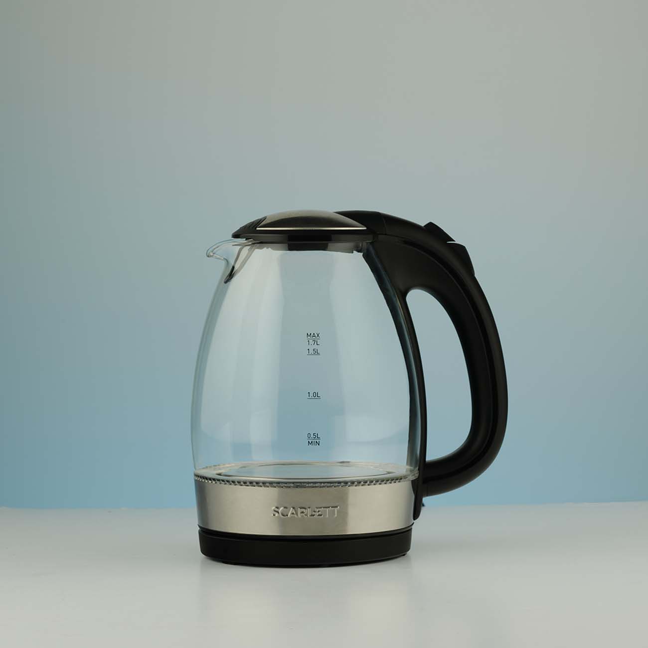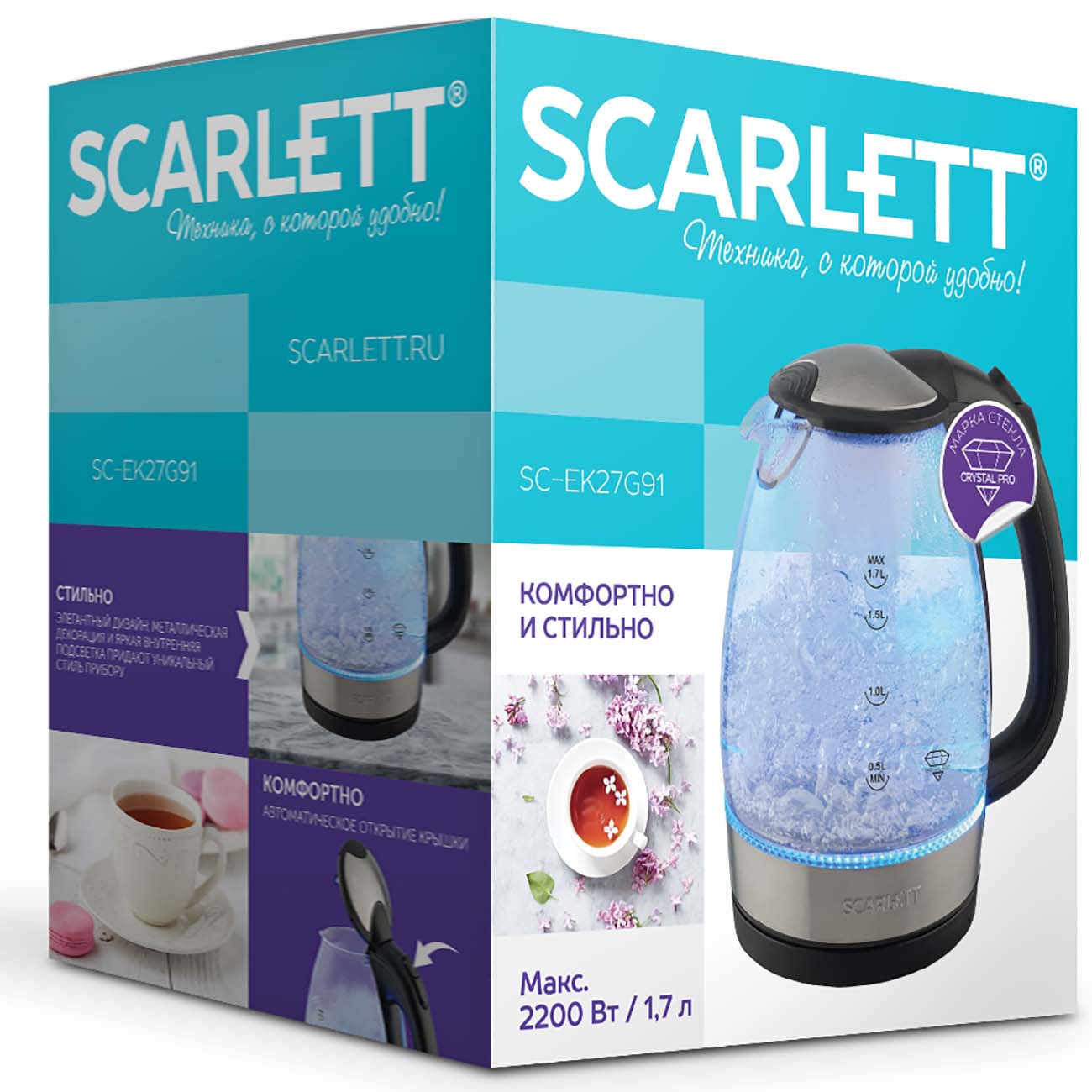 Электрочайник Scarlett SC-EK27G91 — классическая модель с колбой из термостойкого стекла. Скрытый нагревательный элемент и широкое горлышко обеспечивают простоту очищения от накипи. Благодаря мощности 2200 В прибор быстро кипятит воду. На ручке расположена кнопка, которая позволяет откинуть крышку одним движением пальца. В чайнике предусмотрена функция подсветки и система многоуровневой безопасности, минимизирующая риск поломки.