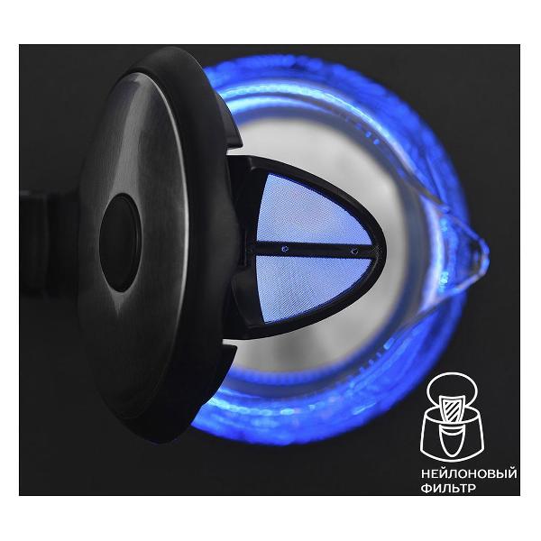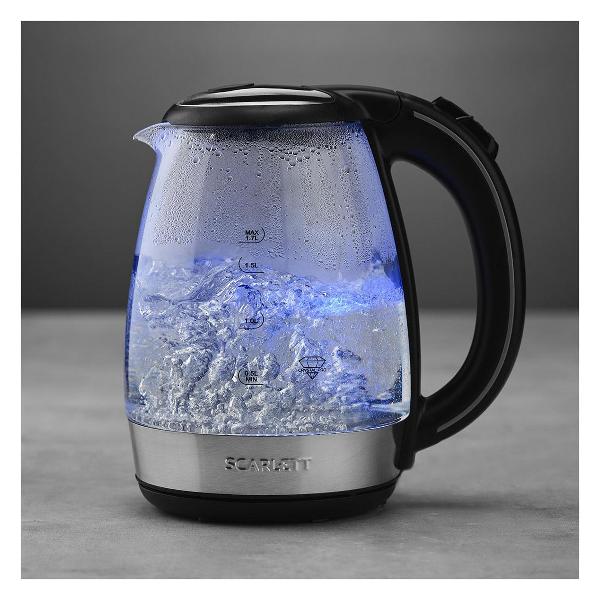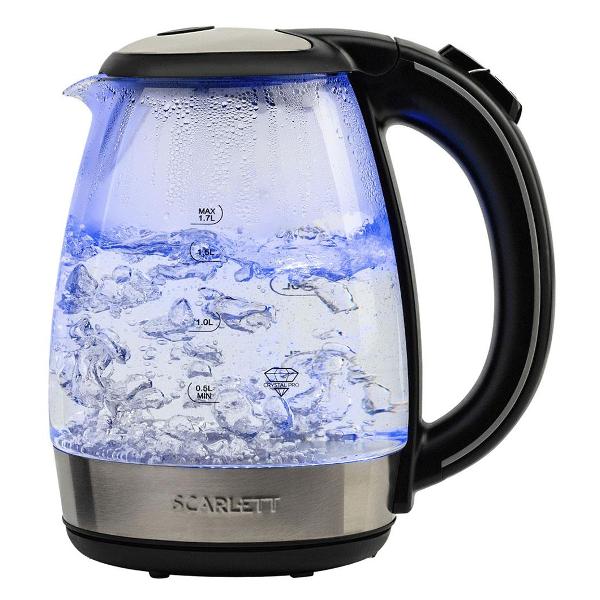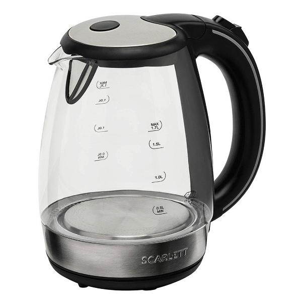 Электрочайник Scarlett SC-EK27G93 черного цвета обладает массой 1,2 кг. У устройства механический тип управления. На лицевой стороне размещены индикаторы включения и уровня воды. Модель оснащается системами выключения при кипении и отсутствии воды, снятии прибора с подставки. На корпусе из стекла и пластика присутствуют отсек для шнура питания и фильтр от накипи. Уровень мощности — не более 2200 Вт.
