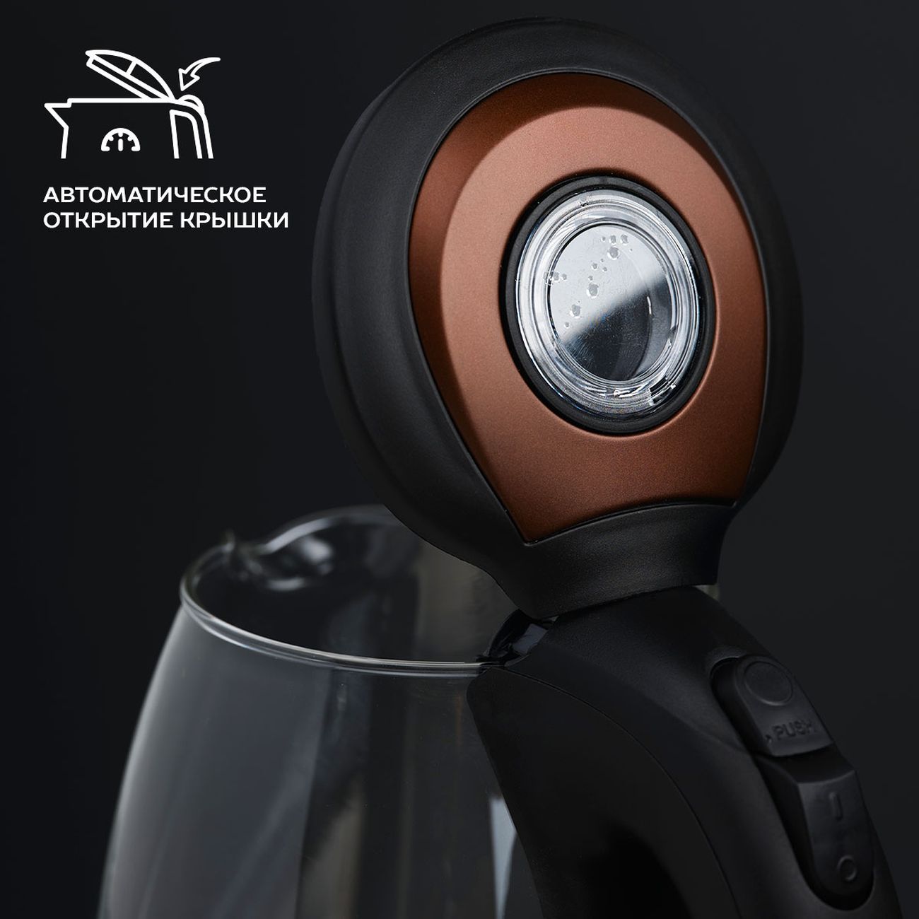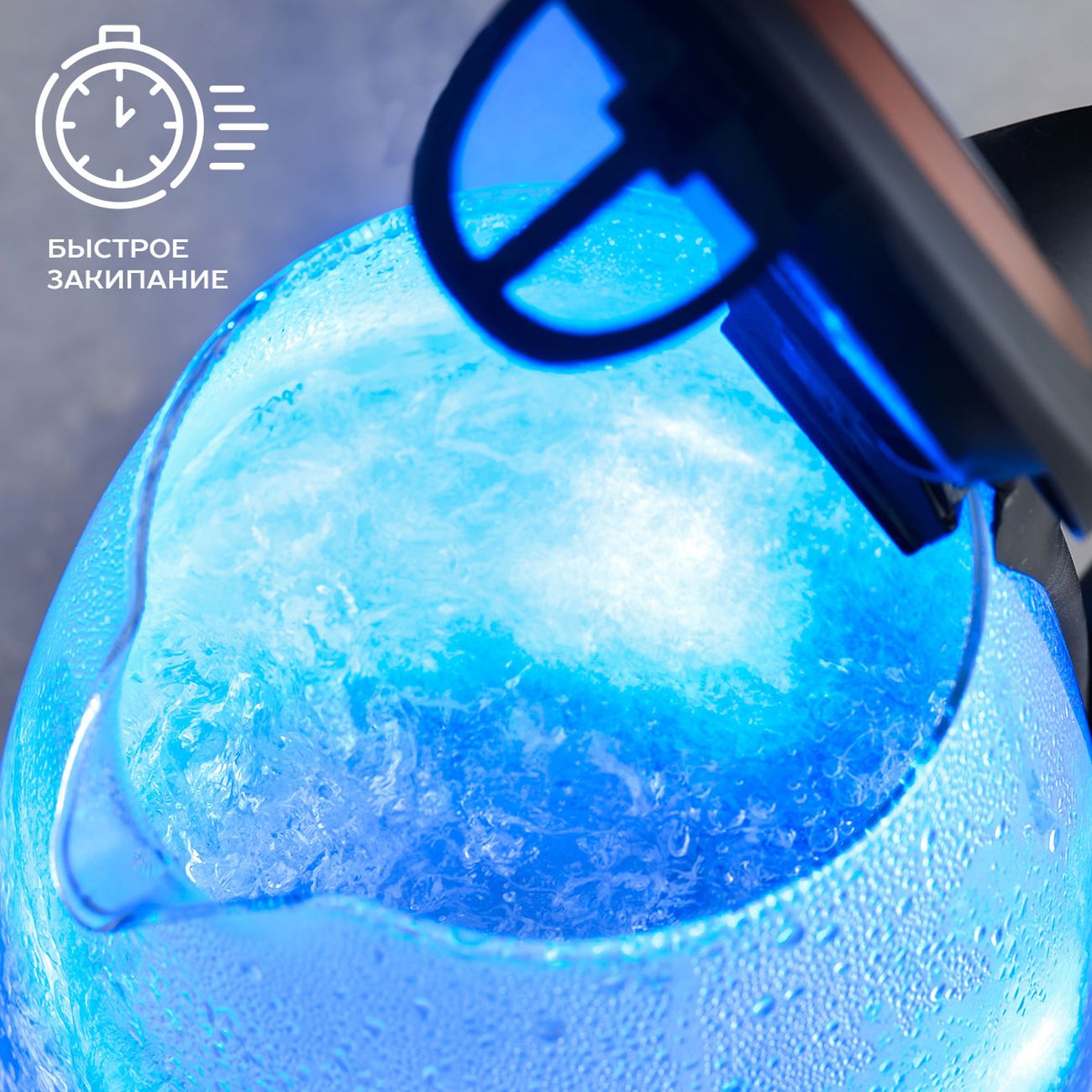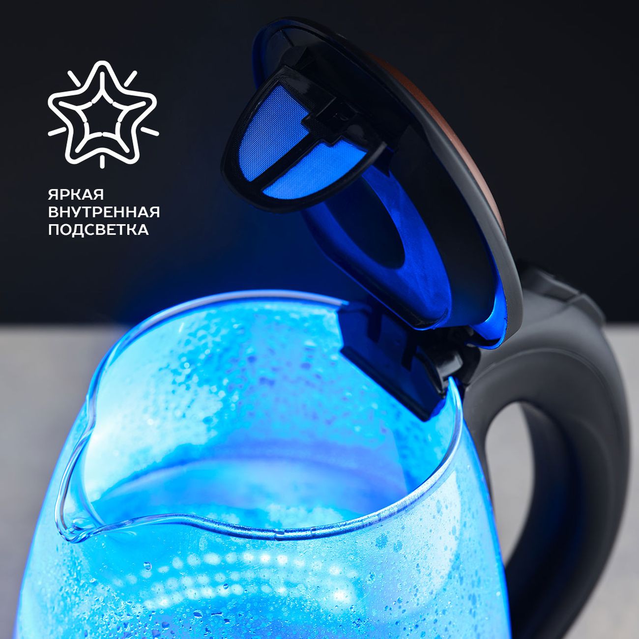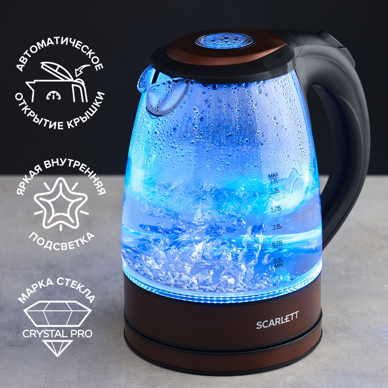 Scarlett SC-EK27G98 можно оставить работающим, не опасаясь выхода из строя: при закипании он отключается сам. А если вы по рассеянности поставите прибор на платформу без воды, он просто не включится.