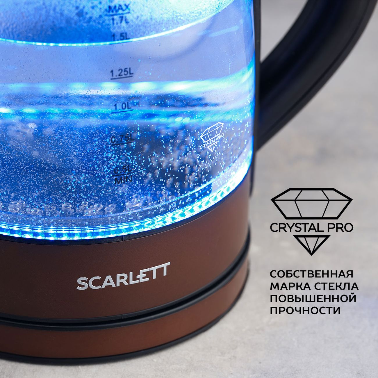 Scarlett SC-EK27G98 – простой в обращении и надёжный чайник для дома и офиса. Благодаря двойному индикатору уровня воды оценить её количество в колбе можно с любой стороны, не разворачивая прибор.