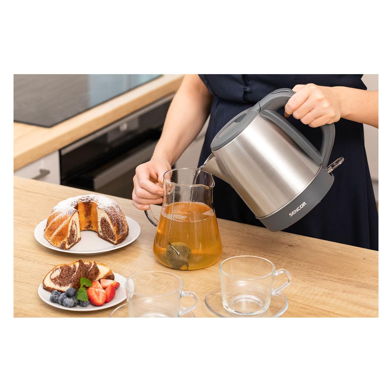 Электрочайник Sencor SWK 2200SS выполнен в объеме 1,2 л. Уровень воды определяется при помощи указателя. Дно сделано из нержавеющей стали, как и нагревательная спираль.