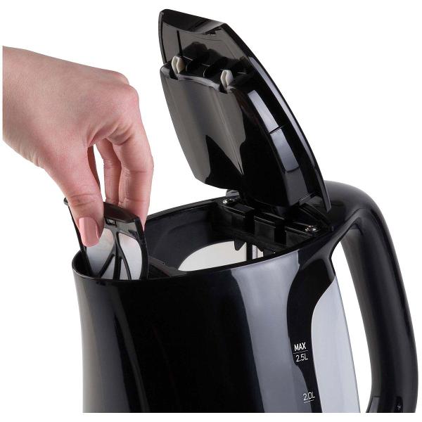 При достижении максимальной температуры нагрева, при снятии чайника с базы питания прибор автоматически выключается. Защиту от попадания накипи обеспечивает фильтр в носике, который можно чистить благодаря съемной конструкции. Доступно вращение на 360° на блоке питания. Длина сетевого кабеля с вилкой — 75 см.