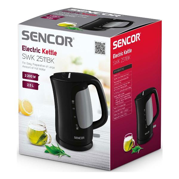 Электрочайник Sencor SWK 2511BK весом 725 г вмещает до 2,5 л воды. Минимальный уровень залива — 0,8 л. Цвет — черный. Корпус изготовлен из термопрочного пластика, оснащен световым индикатором включения и мерной шкалой. Прибор работает от электрической сети 220-240 В, потребляемая мощность составляет 2200 Вт. Нагревательный элемент — ТЭН. Кнопка включения и выключения под расположена под ручкой. У модели один режим работы — нагрев до 100°С.