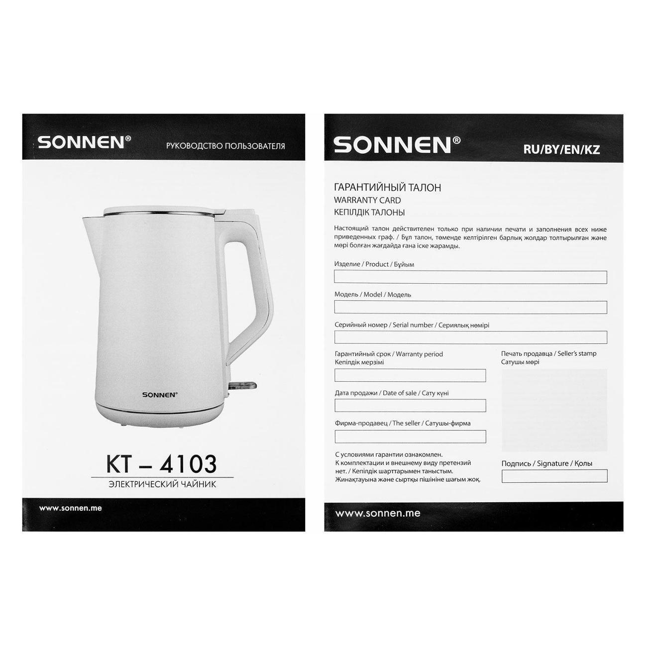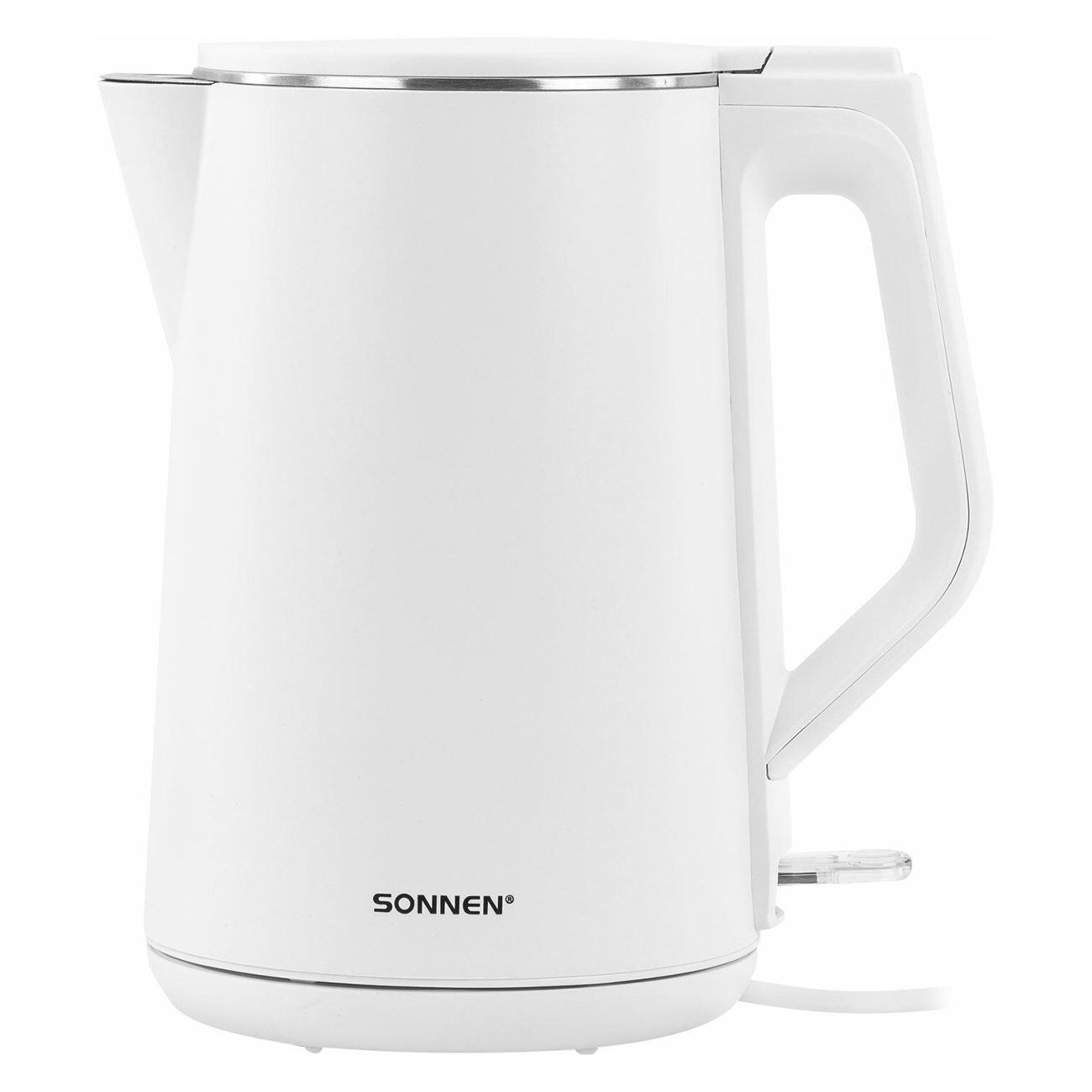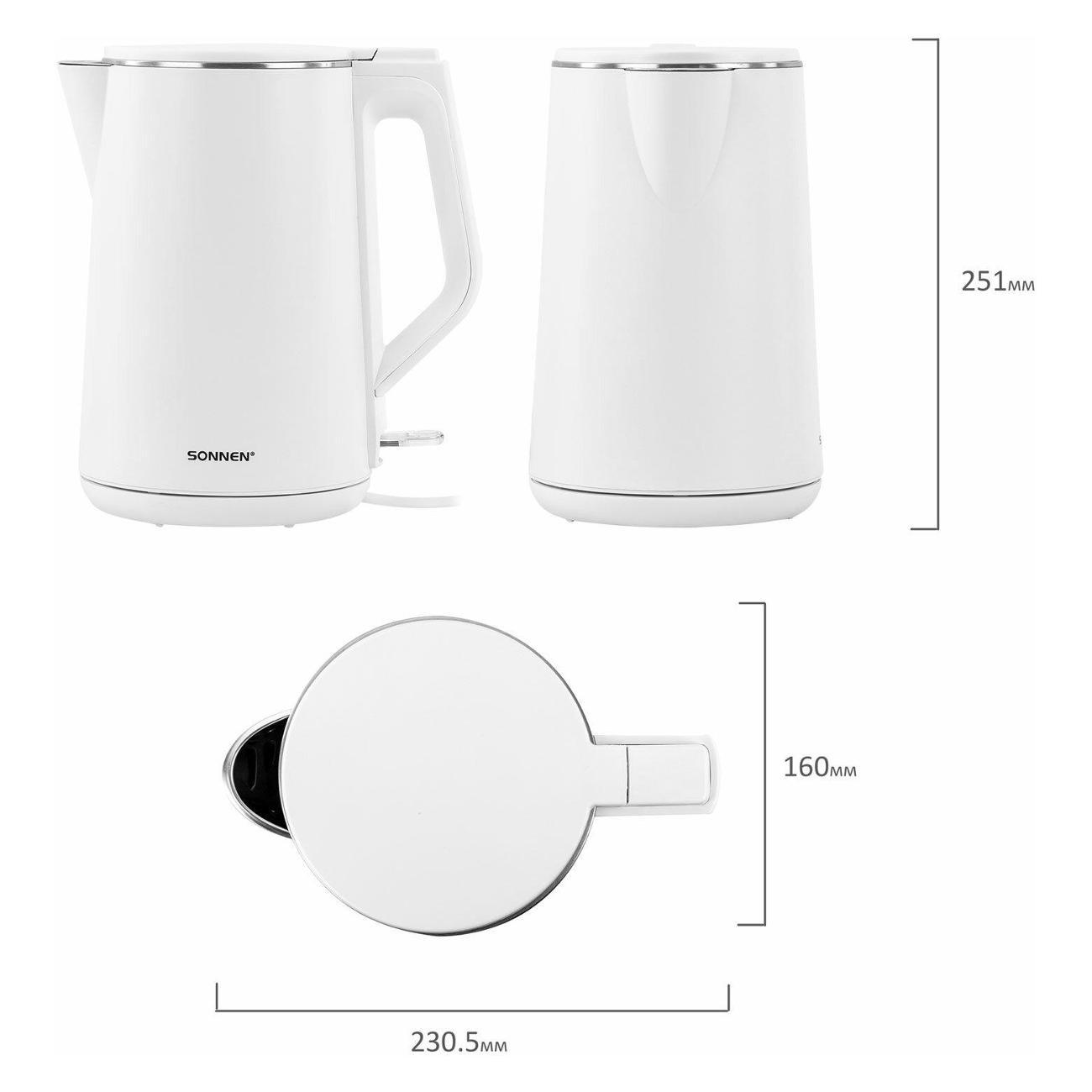 Мощность чайника SONNEN KT-4103 составляет 2200 Вт, что позволяет вскипятить воду за считаные минуты. Пользоваться чайником не только удобно, но и безопасно благодаря корпусу с двойными стенками (внутри – нержавеющая сталь, снаружи – термостойкий пластик), за счёт которых вода остывает медленнее. Кроме того, такая конструкция предотвращает сильный нагрев корпуса.