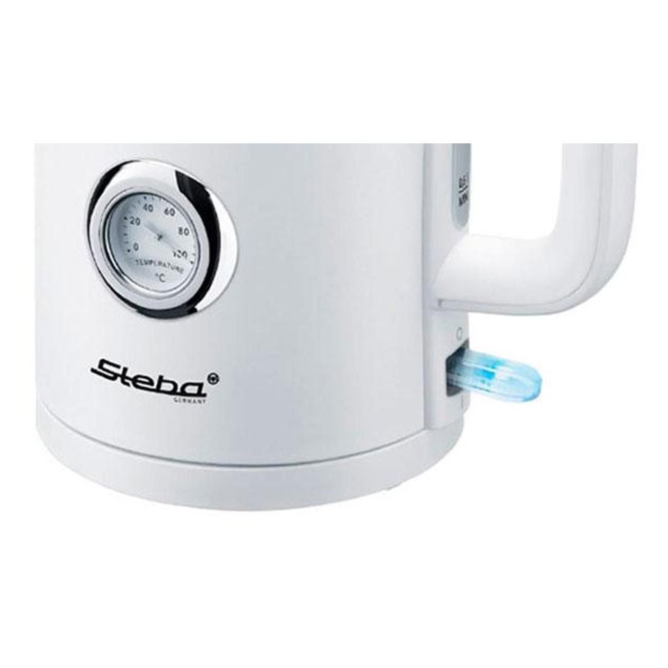 Электрочайник Steba WK белого цвета с механическим типом управления обладает массой 1,1 кг. Прибор оснащается системой отключения при закипании. На лицевой стороне размещаются индикаторы включения, уровня воды и температуры. Корпус выполнен из пластика и оснащается фильтром от накипи. Уровень потребляемой мощности не превышает 2200 Вт.