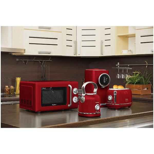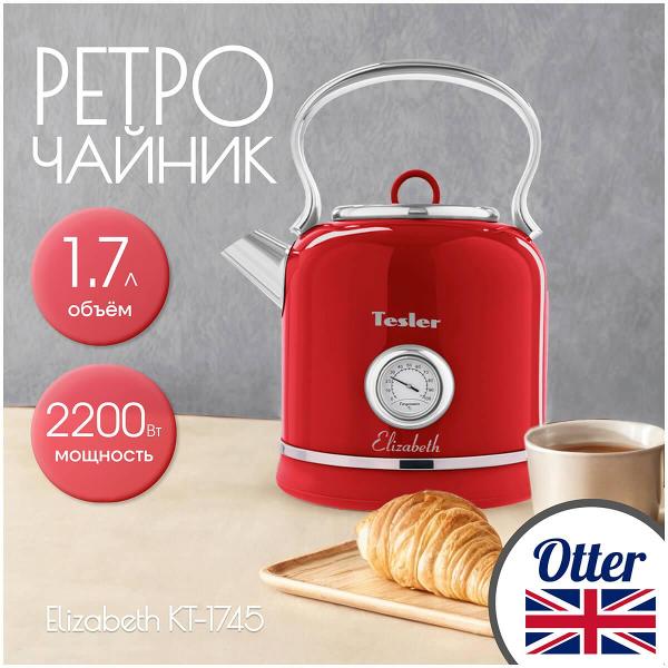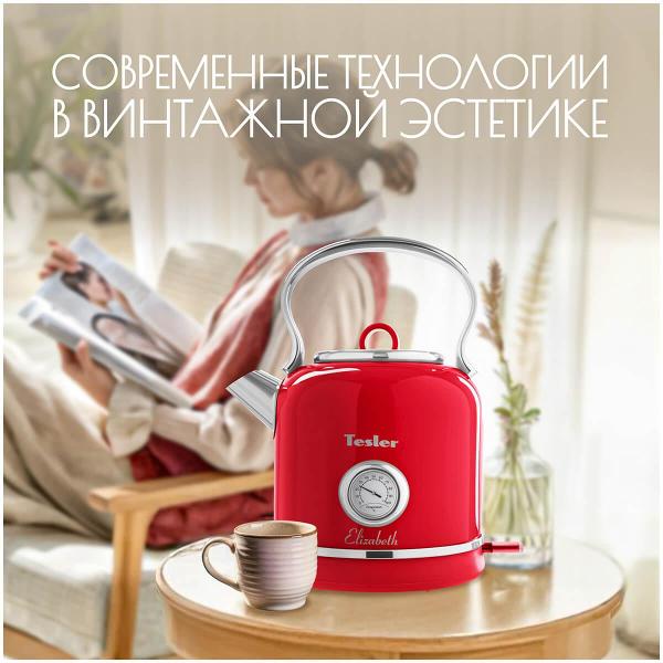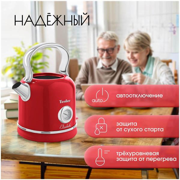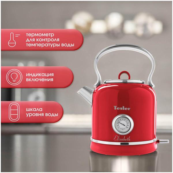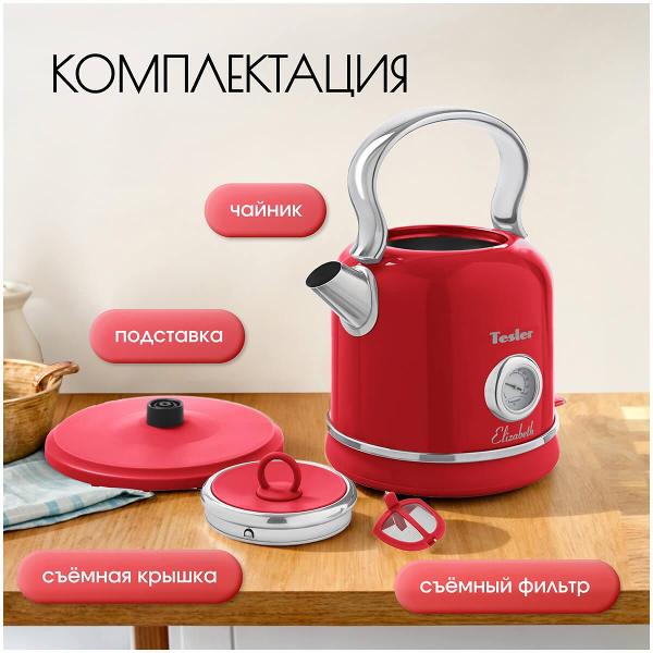 Электрочайник Tesler KT-1745 Red предназначен для кипячения воды объемом 1,7 л. Модель оснащена системой автоматического отключения при закипании, снятии с базы питания, отсутствии жидкости в чайнике. Выполнен из нержавеющей стали с хромированными вставками. На корпусе расположены термометр для контроля температуры нагрева и мерная шкала уровня наполнения. Встроен световой индикатор включения. Сетевой провод не препятствует полному вращению на поставке.