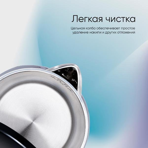 Чайник смотрится красиво и очень солидно, благодаря размерам. Поверхность глянцевая. Внутри вместительный и полностью литой. Привключении загорается синим индикатор на рычажке-включателе. При закимании не очень шумный. Ручка удобная. Крышко открывается с помощью кнопки. Вместимомть 1,7 литра, что позволяет угощать большую семью чаем или кофе. Можно быстро скипятить воду для других нужд. Плюсом является 1 год гарантии, а также не высокая стоимость.
