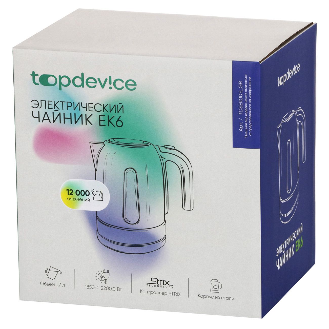 Электрочайник TopDevice TDSEK006_GR представлен в прочном и устойчивом к деформациям корпусе из нержавеющей стали. Обладает объемом 1,7 л. Подходит для дома и офиса. Установлен один режим нагрева, позволяющий вскипятить воду до 100°C.