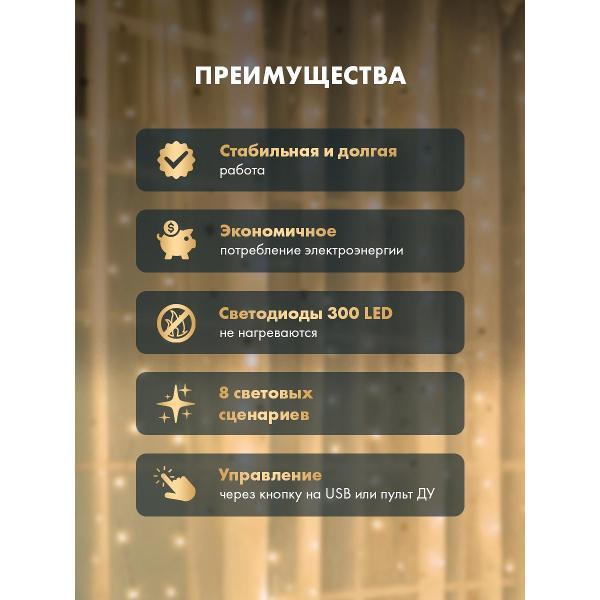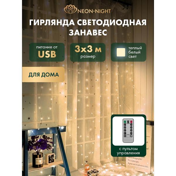 Вы можете купить Электрогирлянда NEON-NIGHT Занавес из росы 3х3 м, тепло-белое свечение, 8 режимов, с пультом и USB, с крючками, 300 диодов (LED-CURTAIN-IN-WW) в магазинах М.Видео по доступной цене. Электрогирлянда NEON-NIGHT Занавес из росы 3х3 м, тепло-белое свечение, 8 режимов, с пультом и USB, с крючками, 300 диодов (LED-CURTAIN-IN-WW): подробное описание, фото и отзывы реальных покупателей, характеристики, возможность скачать инструкции и подобрать аксессуары.