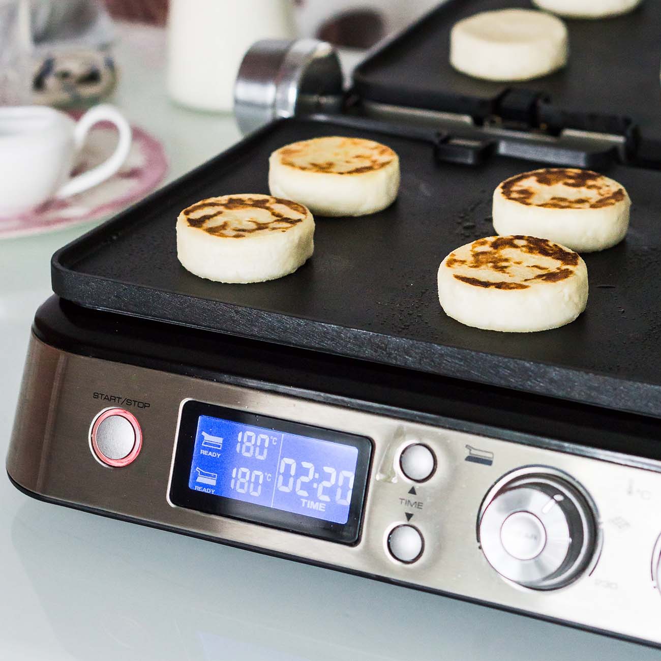 На панели управления расположены поворотные регуляторы для установки температуры нагрева и кнопочный таймер. Информация о заданных настройках выводится на чёткий ЖК-дисплей.
