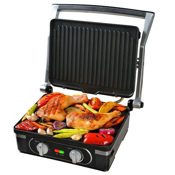 Полностью опустите крышку, чтобы ускорить приготовление. Вы также можете поднять её, чтобы сохранить нежную фактуру продуктов, или откинуть на 180 градусов, вдвое увеличив площадь рабочей поверхности.