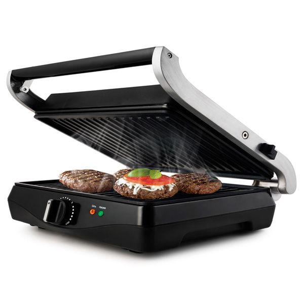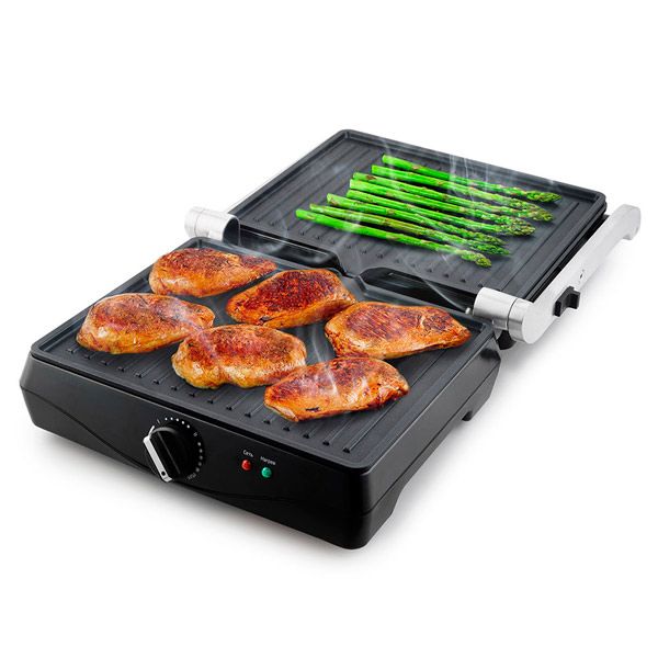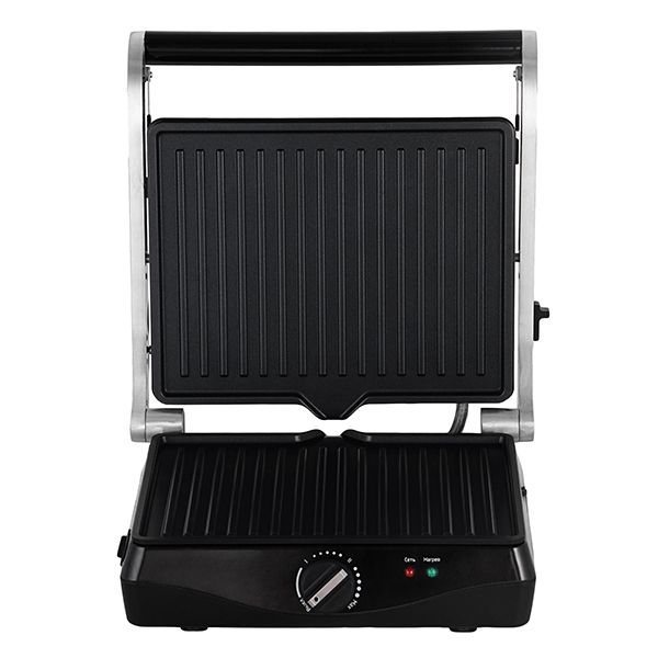 Корпус оснащен механическим регулятором температуры и световыми индикаторами: красный загорается при включении, зеленый — при разогреве до рабочей температуры. Крышка откидывается на 180°, позволяя увеличить площадь приготовления блюд.