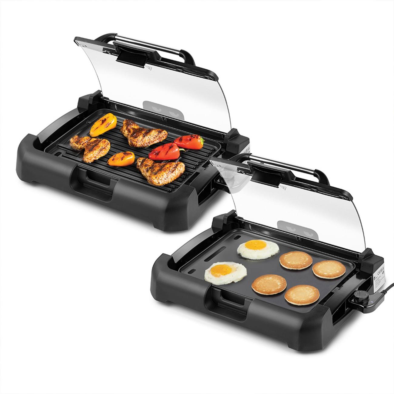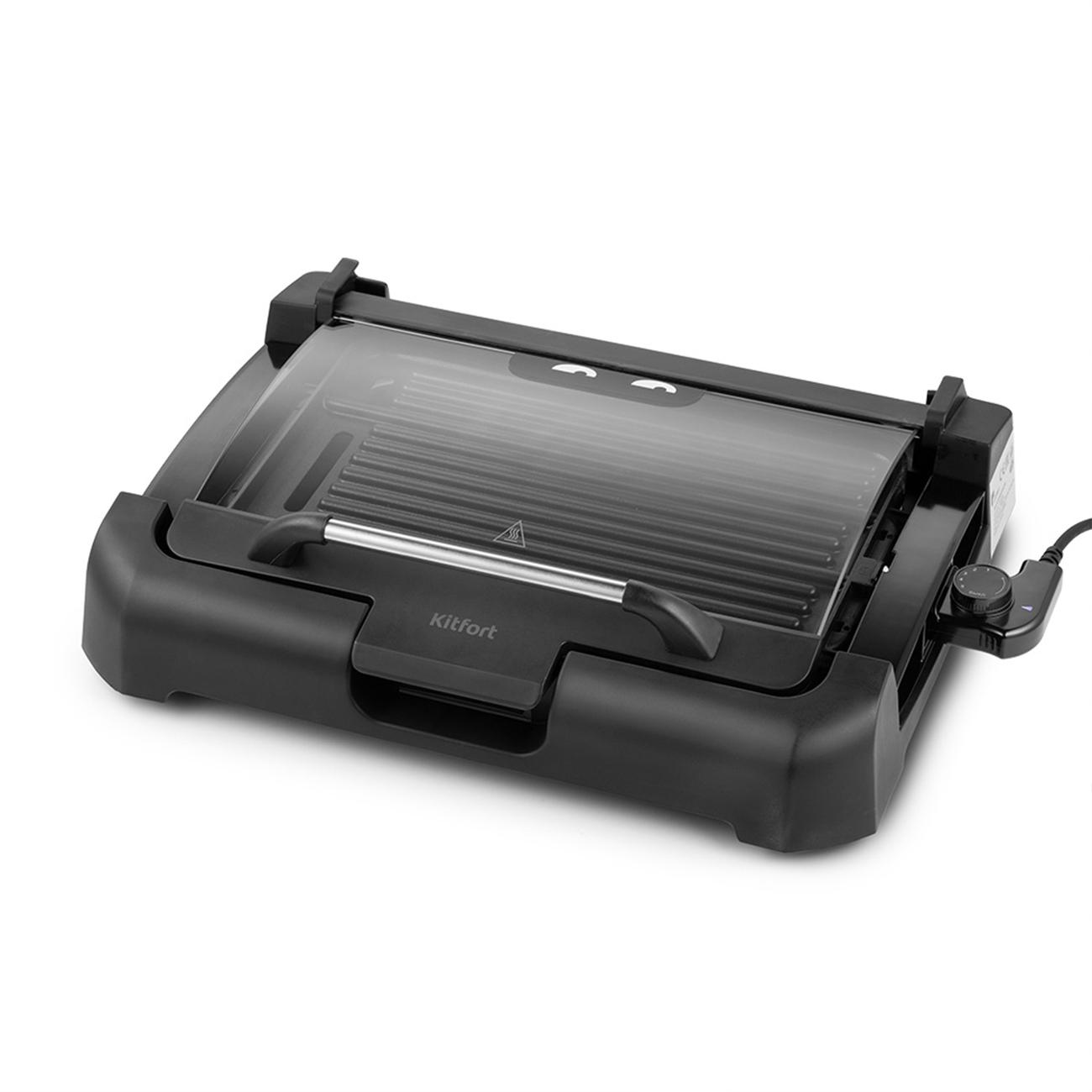 Электрогриль Kitfort КТ-1673 — модель в корпусе черного цвета, подходящая для приготовления блюд из мяса, рыбы и овощей. Температура нагрева составляет от 140°C до 240°C. Антипригарная панель двусторонняя. С одной стороны она гладкая, с другой — рифленая. Это позволяет готовить блюда с «полосатым» рисунком. Рабочая панель выполнена из алюминия. Мощность прибора достигает 1800 Вт. Для подключения к сети используется шнур длиной 1 м. Предусмотрено пять автоматических программ и пять температурных режимов. Тип управления — механический.