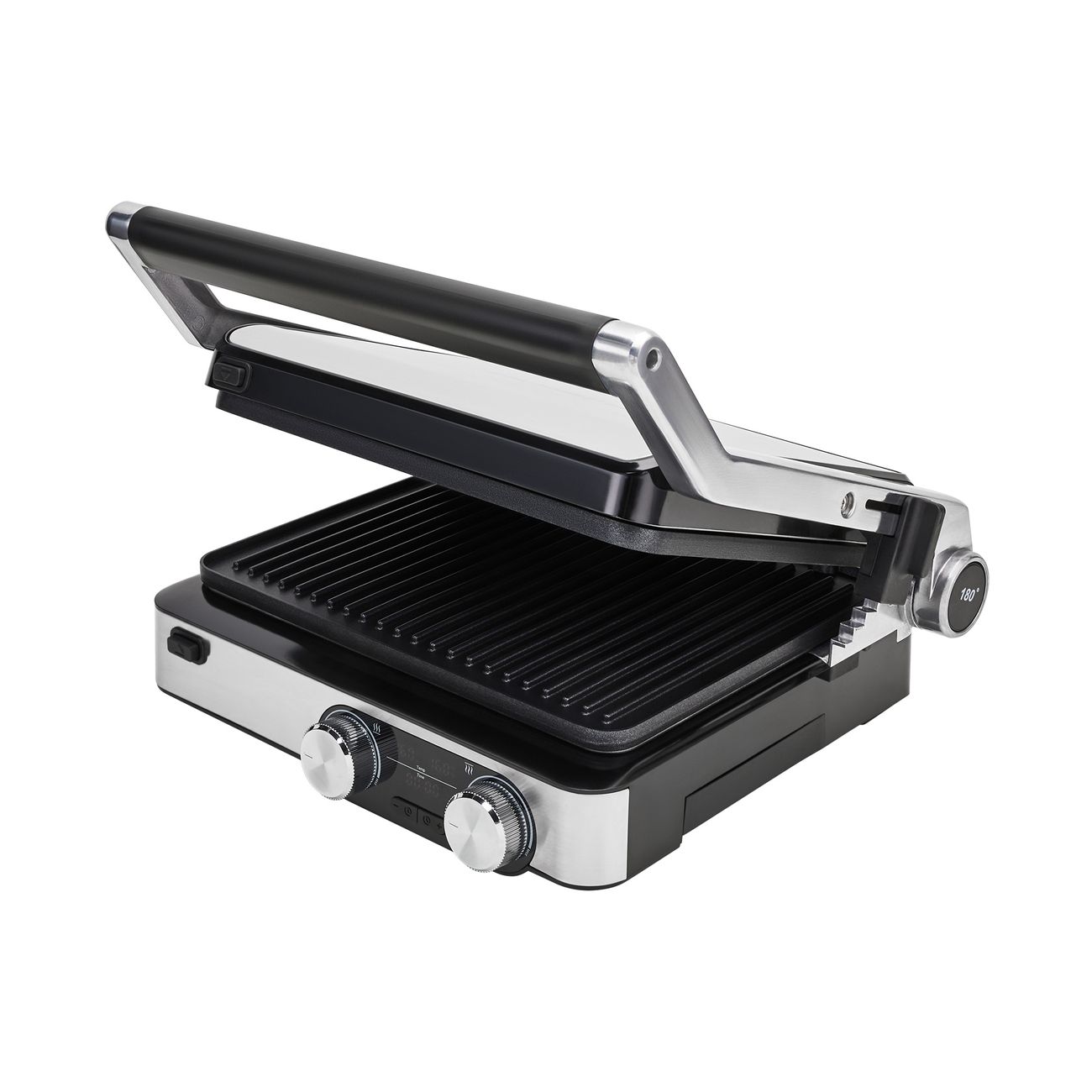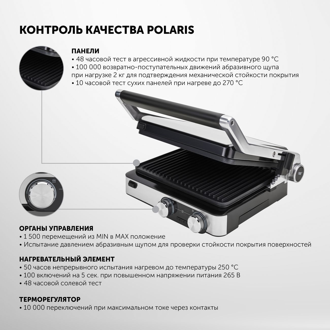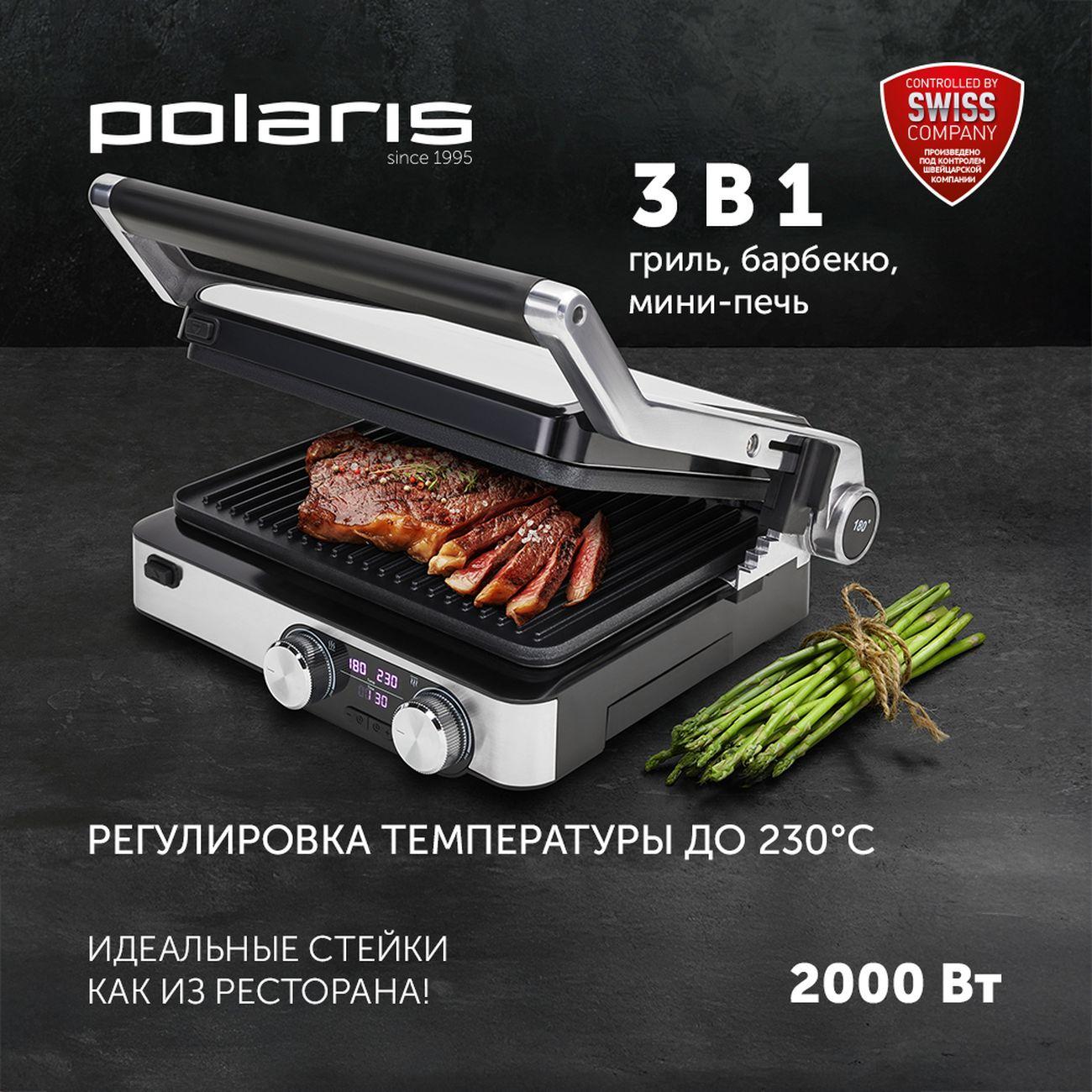 Электрогриль Polaris PGP 2302D Silver оснащен функциями гриля, мини-печи и барбекю. Две съемные панели размерами 29х23 см с опцией раскрывания на 180° обладают антипригарным покрытием, которое исключает прилипание пищи и обеспечивает равномерное обжаривание. По специальным каналам жир плавно стекает в поддон.