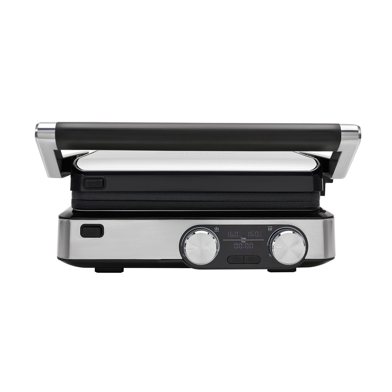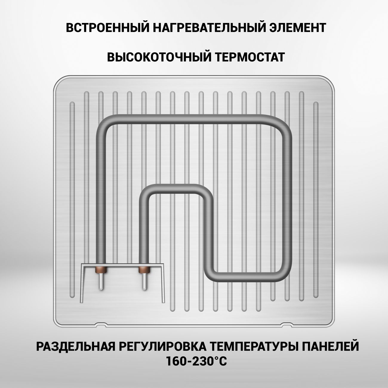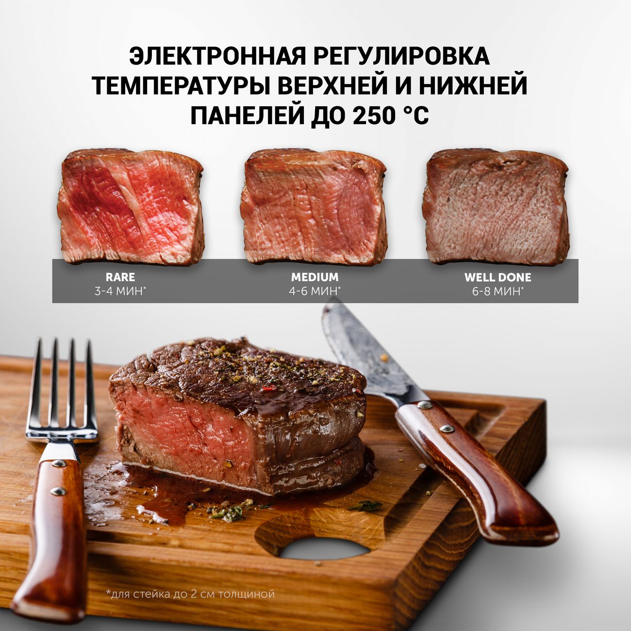 Показатель потребляемой мощности модели — 2000 Вт. Все выбранные настройки выводятся на дисплей. Световые индикации показывают состояние электрогриля.