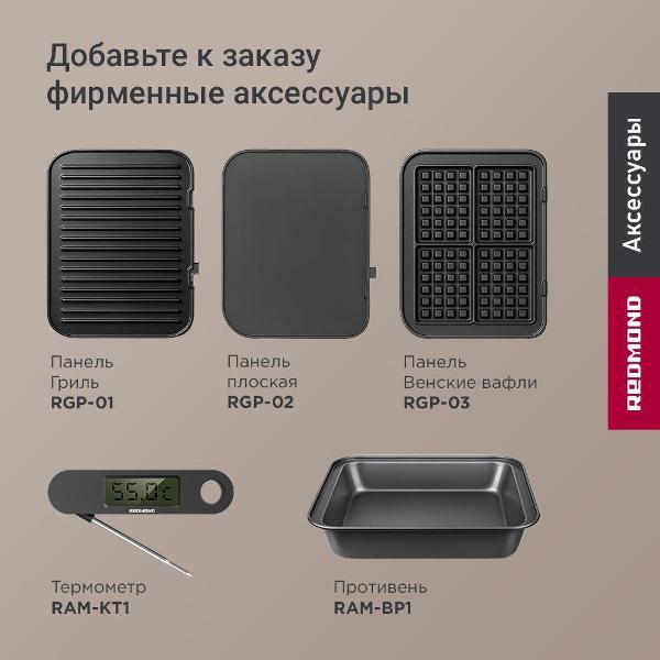 Электрогриль Redmond GM303 (бежевый) — многофункциональное устройство формата «3 в 1», способное полноценно заменить на кухне классический гриль, духовку и открытую панель для барбекю.