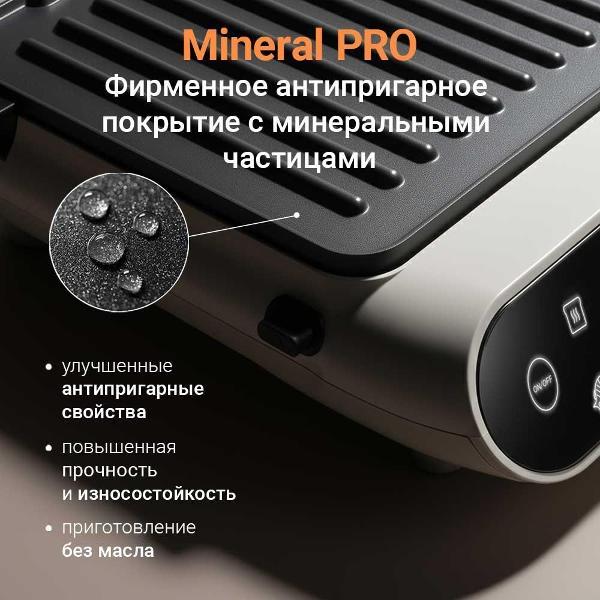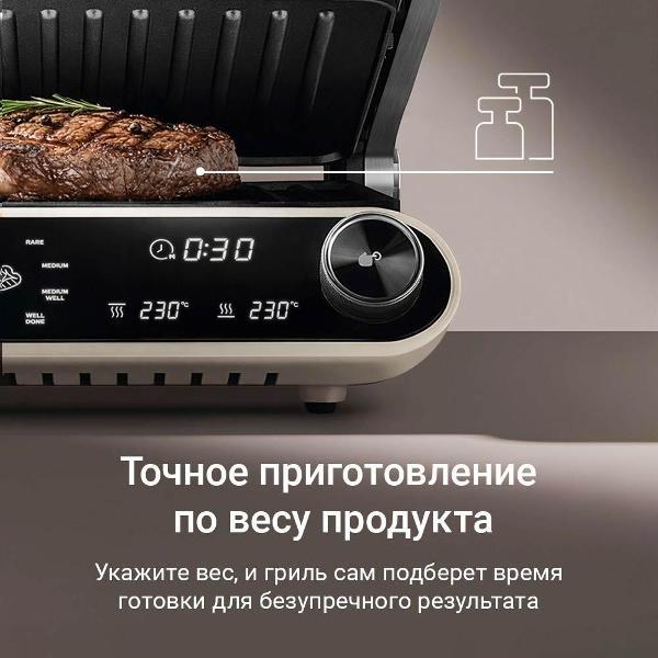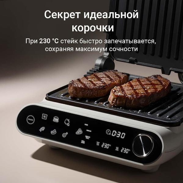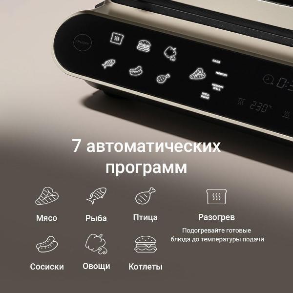 Прибор оснащен предустановленными программами для приготовления стейков, птицы, сосисок, рыбы, овощей, а также котлет для бургеров. Достаточно положить ингредиенты на рабочую поверхность и выбрать соответствующую иконку на сенсорной панели.