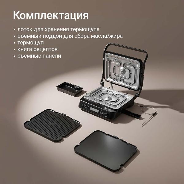 Таймер регулируется с высокой точностью до одной секунды, а максимальное время приготовления составляет 90 минут. В комплект включены термощуп с лотком для хранения, съемный поддон для масла и красочная книга рецептов.