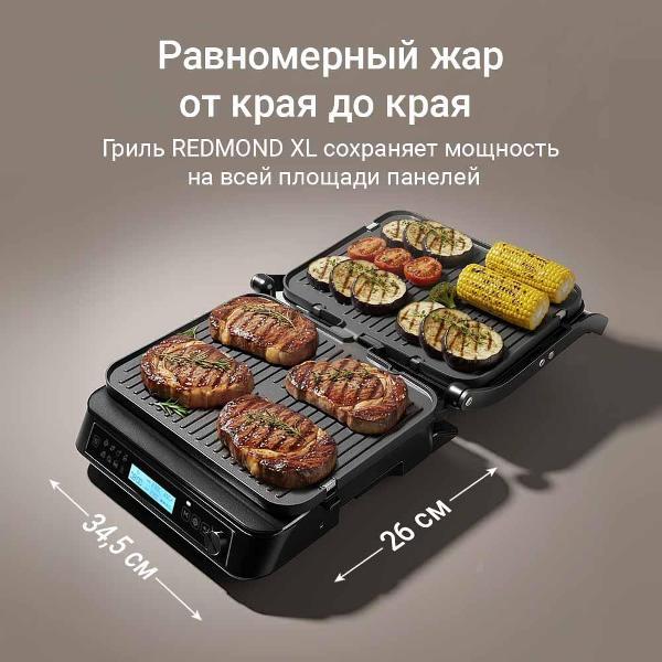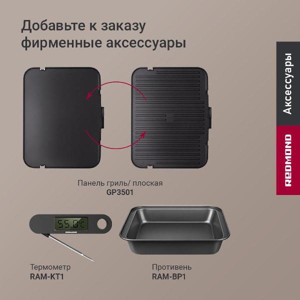 Электрогриль Redmond GM306 — продвинутое устройство формата «3 в 1», объединяющее возможности контактного гриля, открытой площадки для барбекю и полноценной духовки.