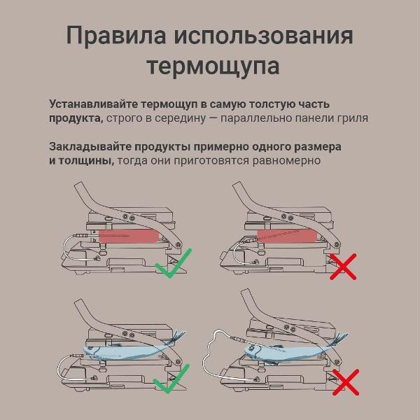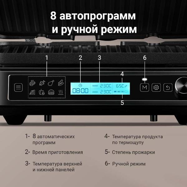 Специальный датчик в сочетании с AI-алгоритмами измеряет внутреннюю температуру мяса или рыбы каждую секунду. Прибор автоматически прекращает нагрев при достижении выбранной степени готовности.