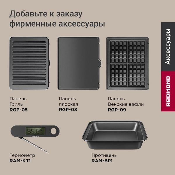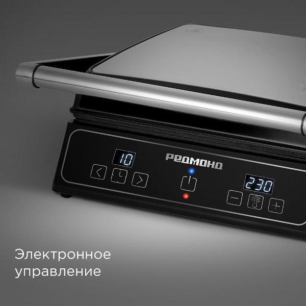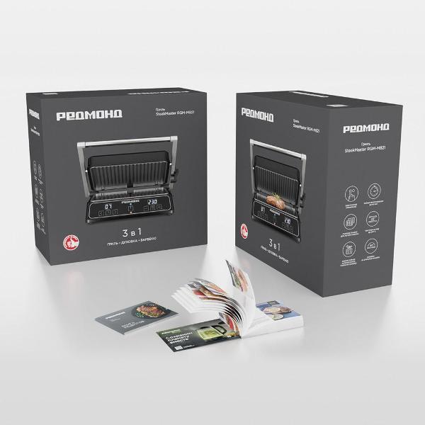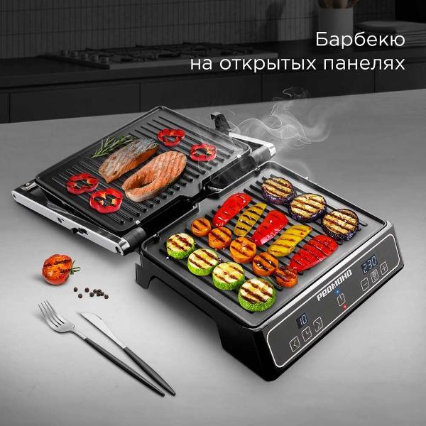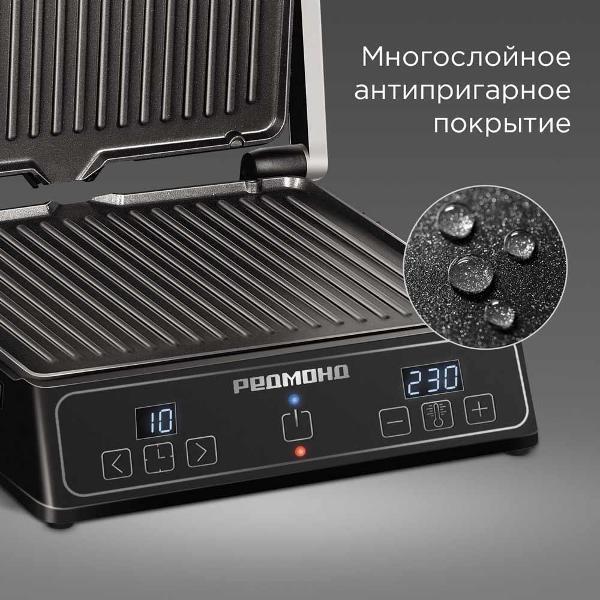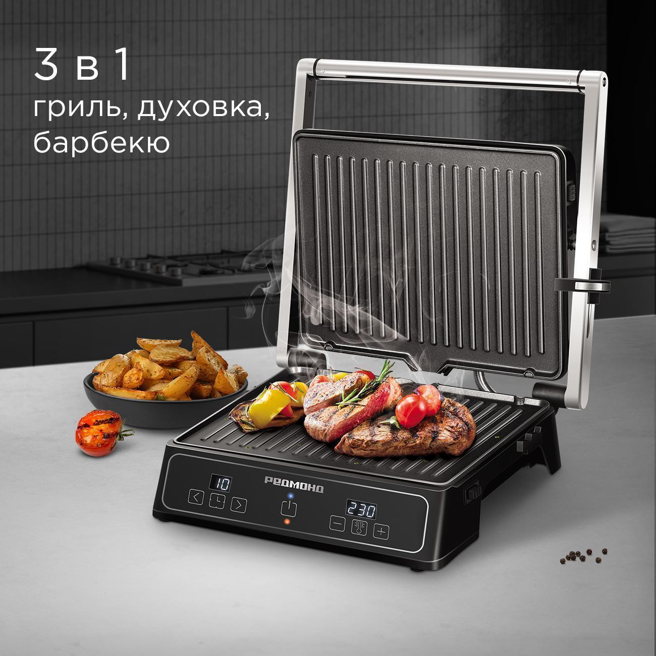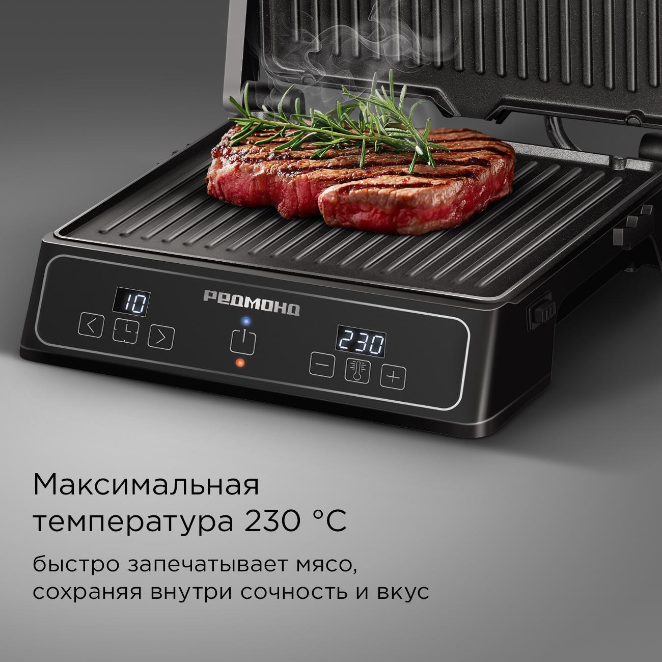 Электрогриль Redmond RGM-M821черного цвета позволяет профессионально обжаривать мясо и овощи благодаря точному электронному управлению и разогреву рабочих поверхностей до 230 °С.