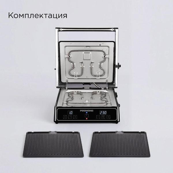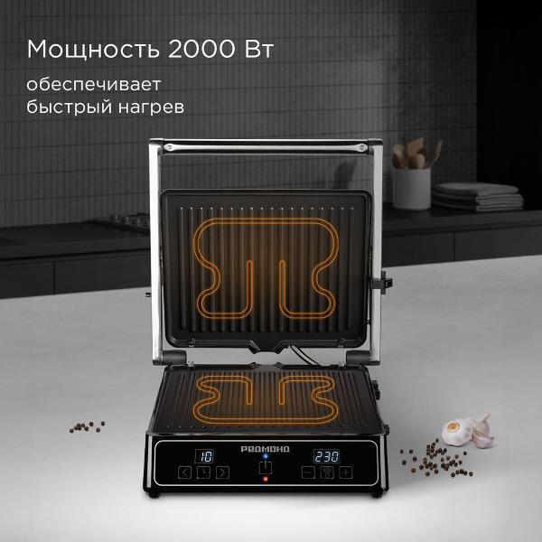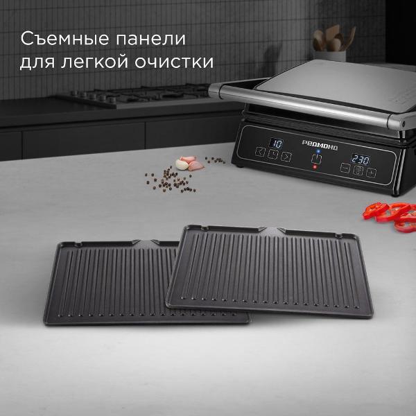 Металлический корпус черного цвета оснащен контрастным дисплеем и световыми индикаторами питания. Съемные панели размером 285х222 мм и лоток для сбора жира значительно упрощают уход за прибором. Безопасность эксплуатации обеспечивается защитой от перегрева и первым классом защиты от поражения током.