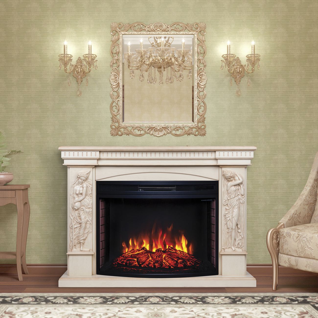 Электрический камин RealFlame Diva 33 WT+FS 33 SIR предназначен для пристенного размещения на полу. Размер составляет 97x138,5x45 см. Конструкция модели включает в себя прочный портал, выполненный из МДФ и шпона, и очаг с декором в виде обгоревших поленьев. Применена технология защиты от перегрева. В максимальном режиме обогрева предельный показатель потребляемой мощности не превышает 1700 Вт.