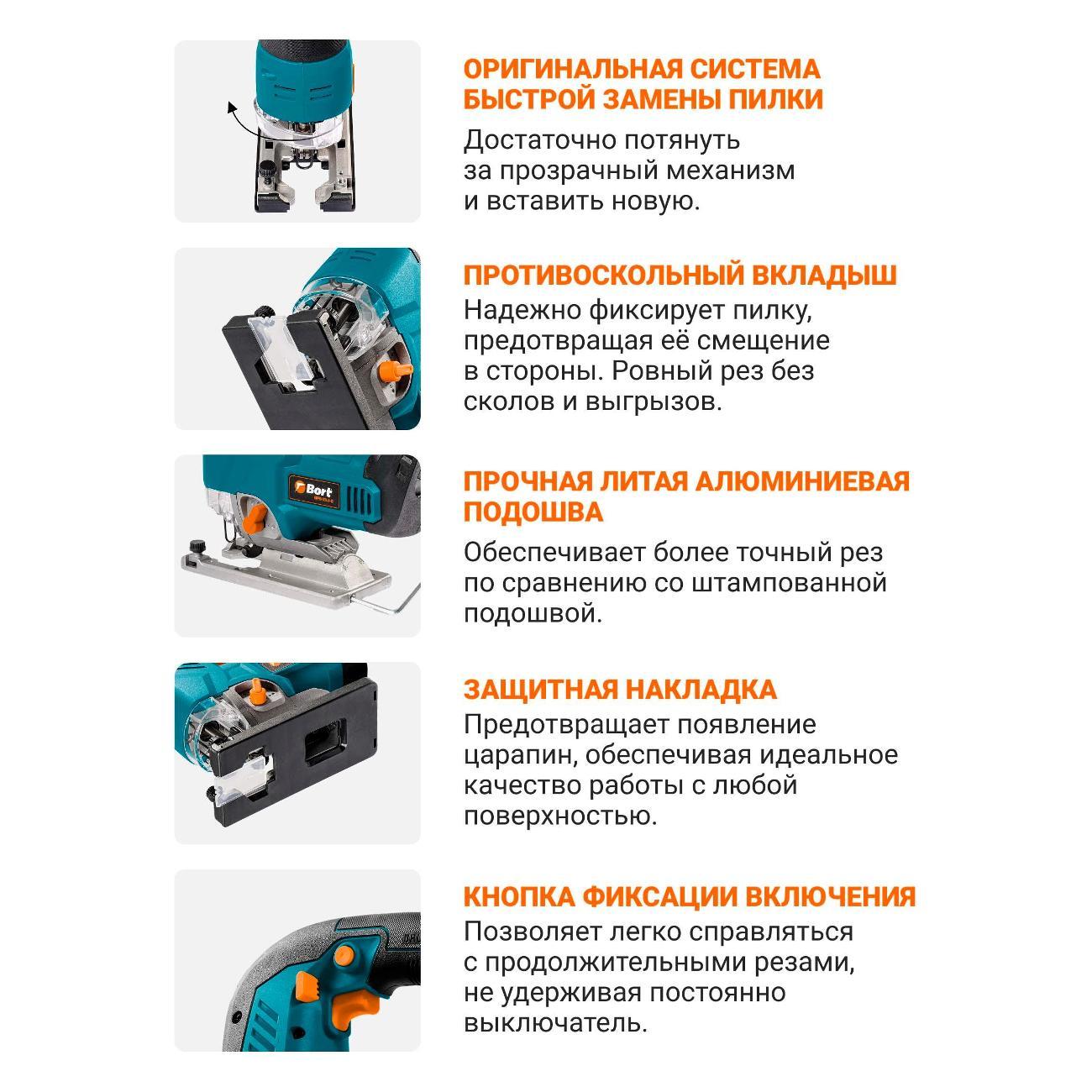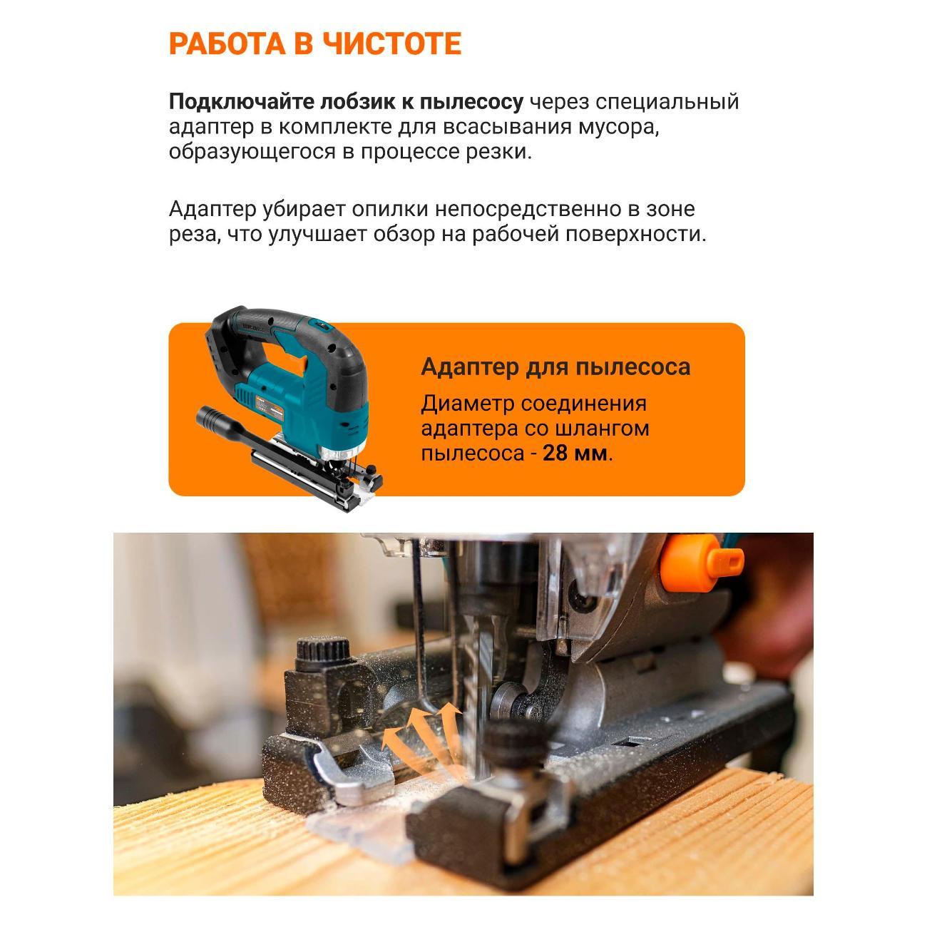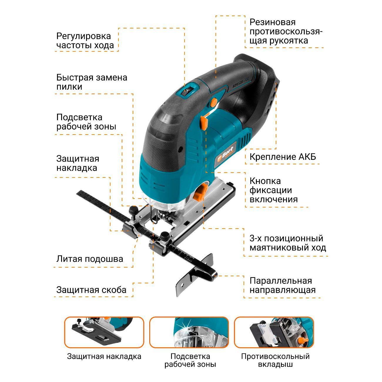 Светодиодная подсветка освещает рабочую зону для лучшей видимости разметки. Прорезиненная рукоятка обеспечивает надежный хват, а кнопка фиксации включения избавляет от необходимости постоянно удерживать курок при выполнении длинных пропилов.